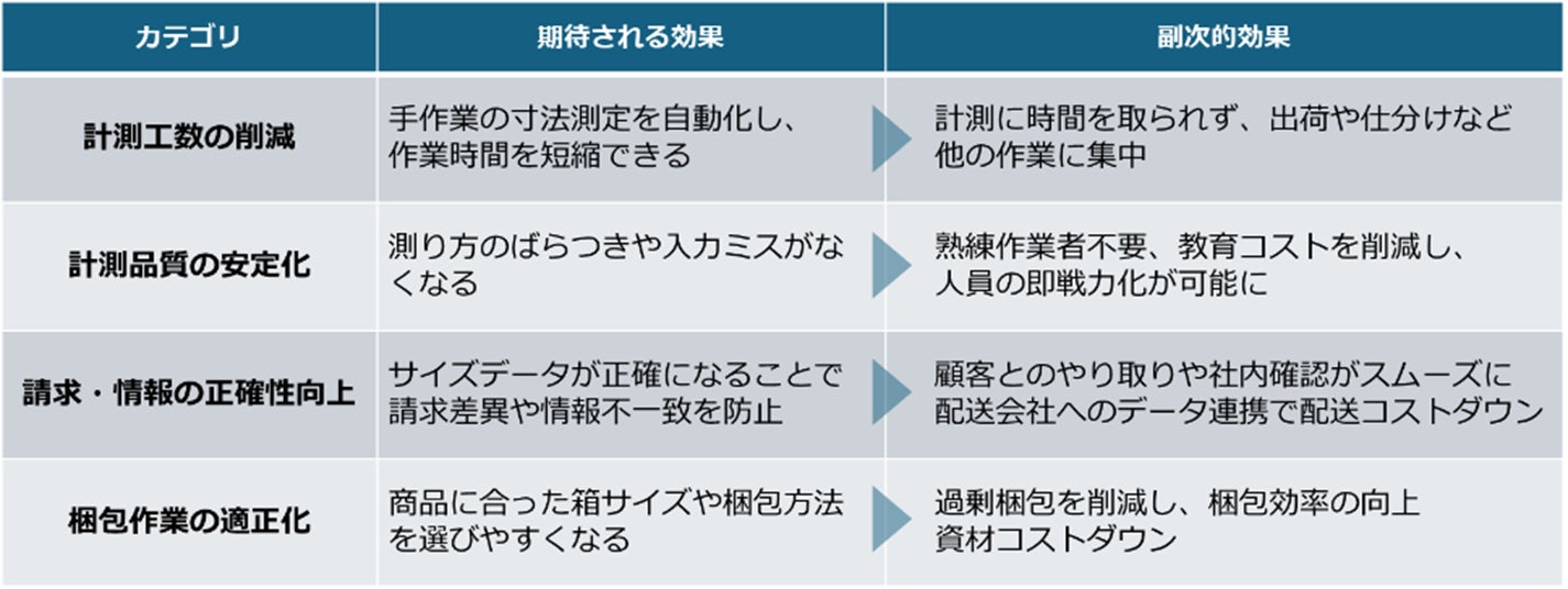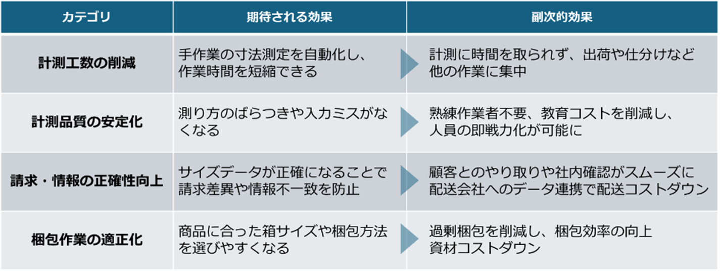 近年、Bin to Person型自動倉庫など自動化設備の導入が進み、取扱商品の寸法・重量データの整備ニーズが高まっています。入荷品のマスタ情報不足を現場で補完することで、入荷~保管・格納の設計に活かすことが可能となります。入荷工程で寸法・重量データが揃った商品マスタを整えることは出荷オペレーションにおける梱包資材の最適化や配送コストの低減にもつながり倉庫内作業全体の効率化とコスト削減を実現します。