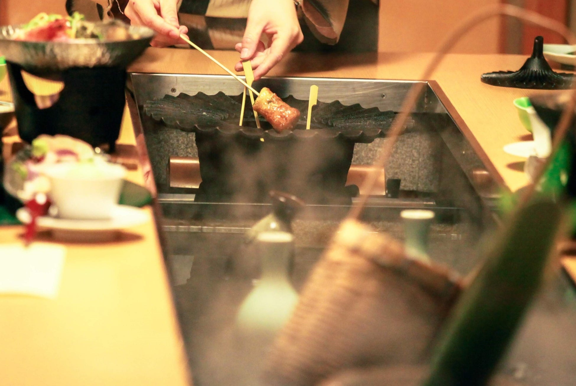 3.個室風お食事処では食卓の中央に温泉が湧き出る「温泉卓」にてご用意
