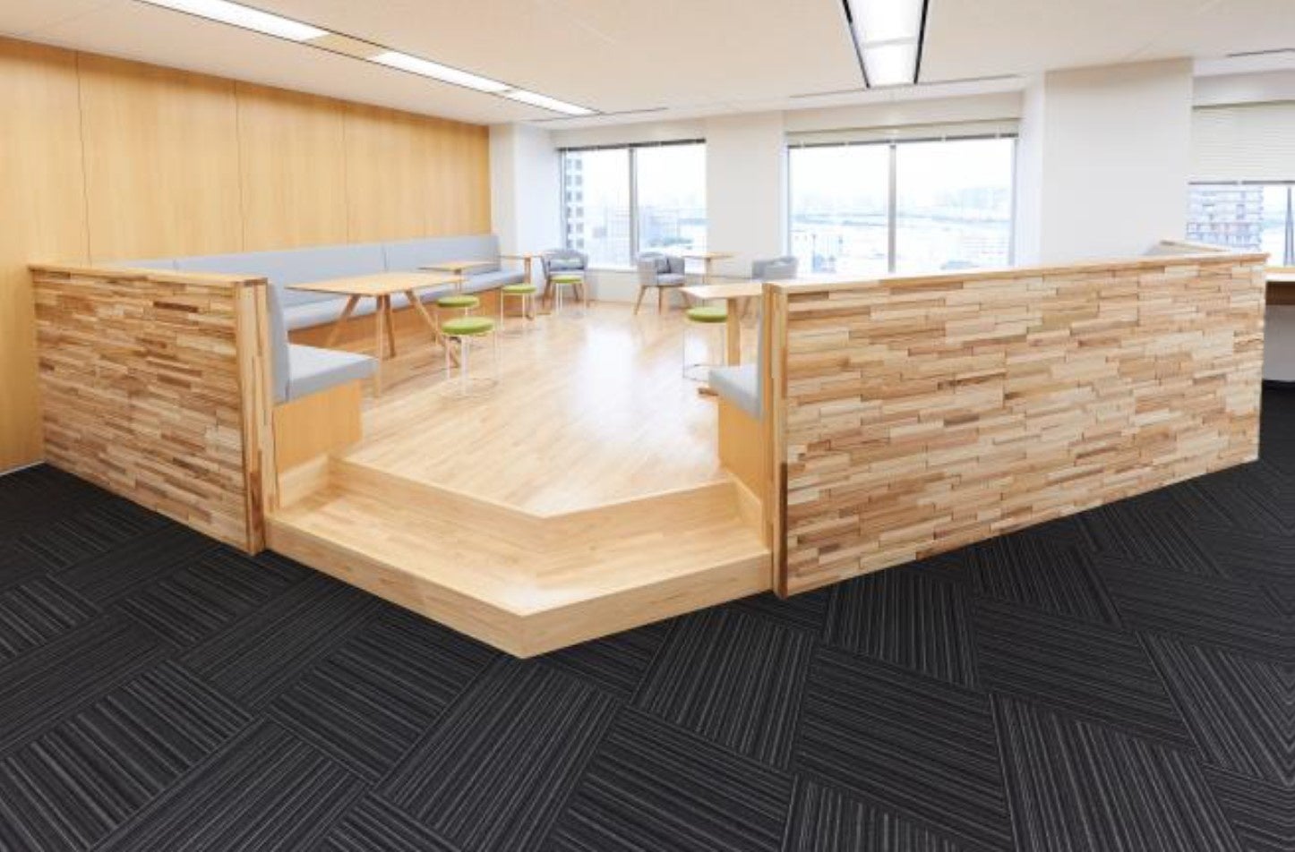 地球環境に優しい集成材を使用した什器をオフィス空間に取り入れることで、木の温もりや香りがリラックス効果を促進し、人にも地球にもやさしいオフィス空間を実現。