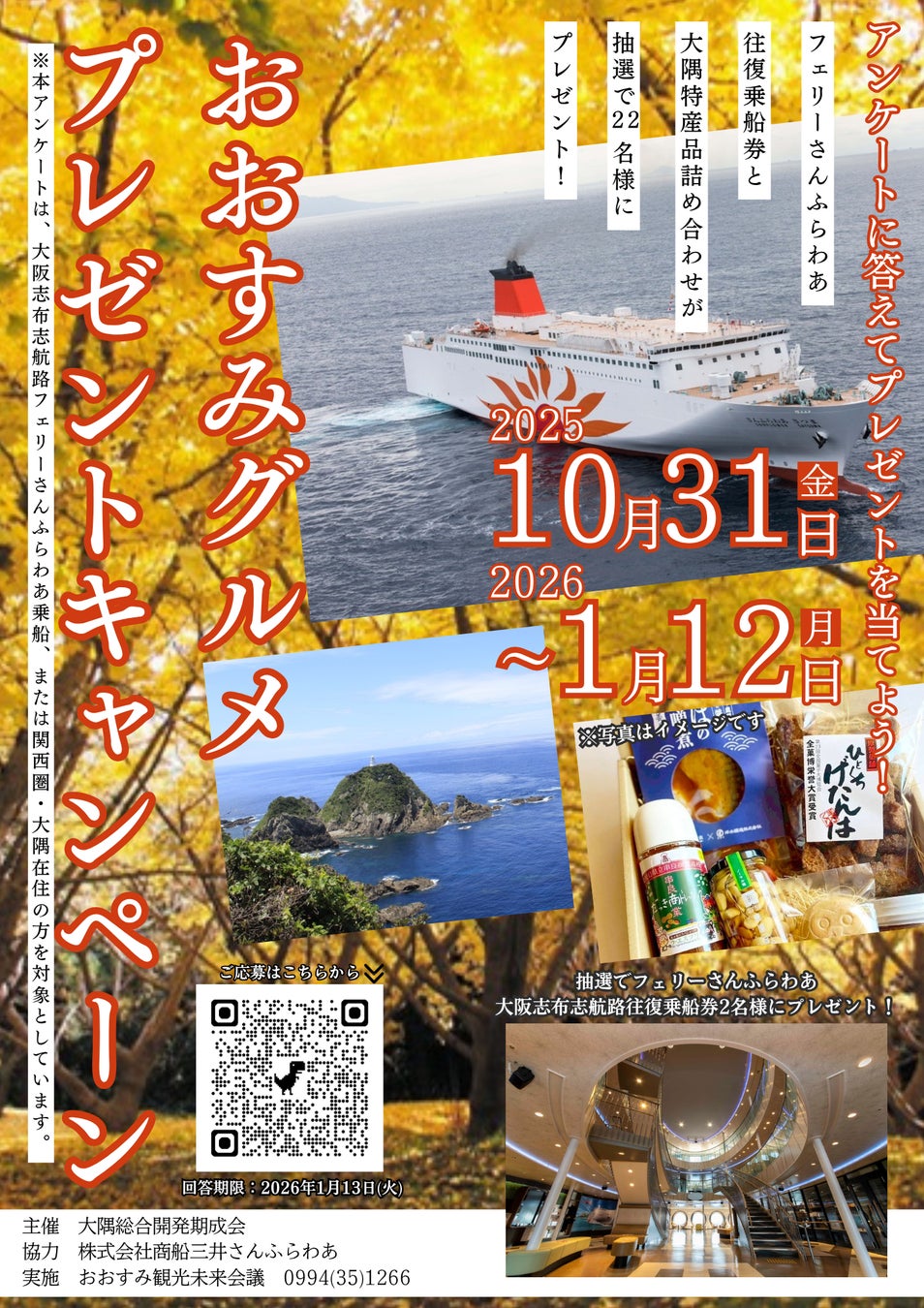 期間中、「大阪南港」や「大阪志布志航路フェリーさんふらわあ船内」で配られるチラシに記載された二次元バーコードを読み込んでアンケートに回答していただくと、抽選でさんふらわあ乗船券や大隅地域特産品をプレゼントいたします。