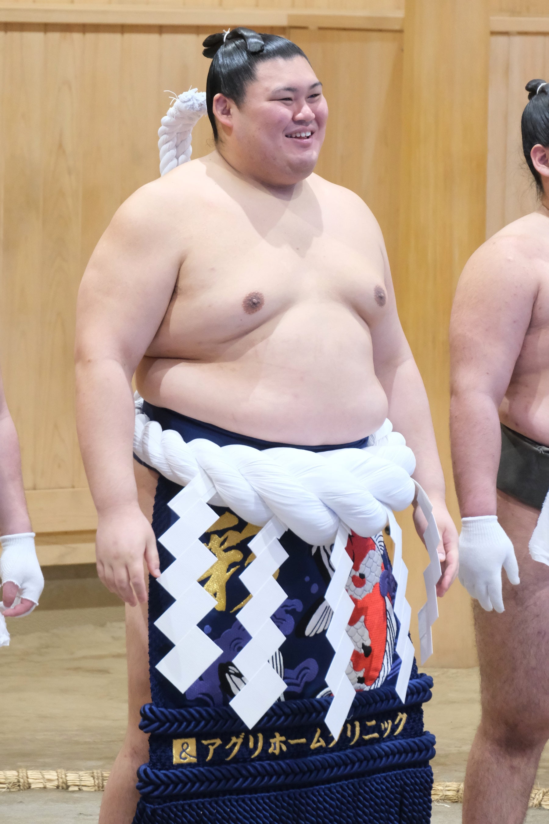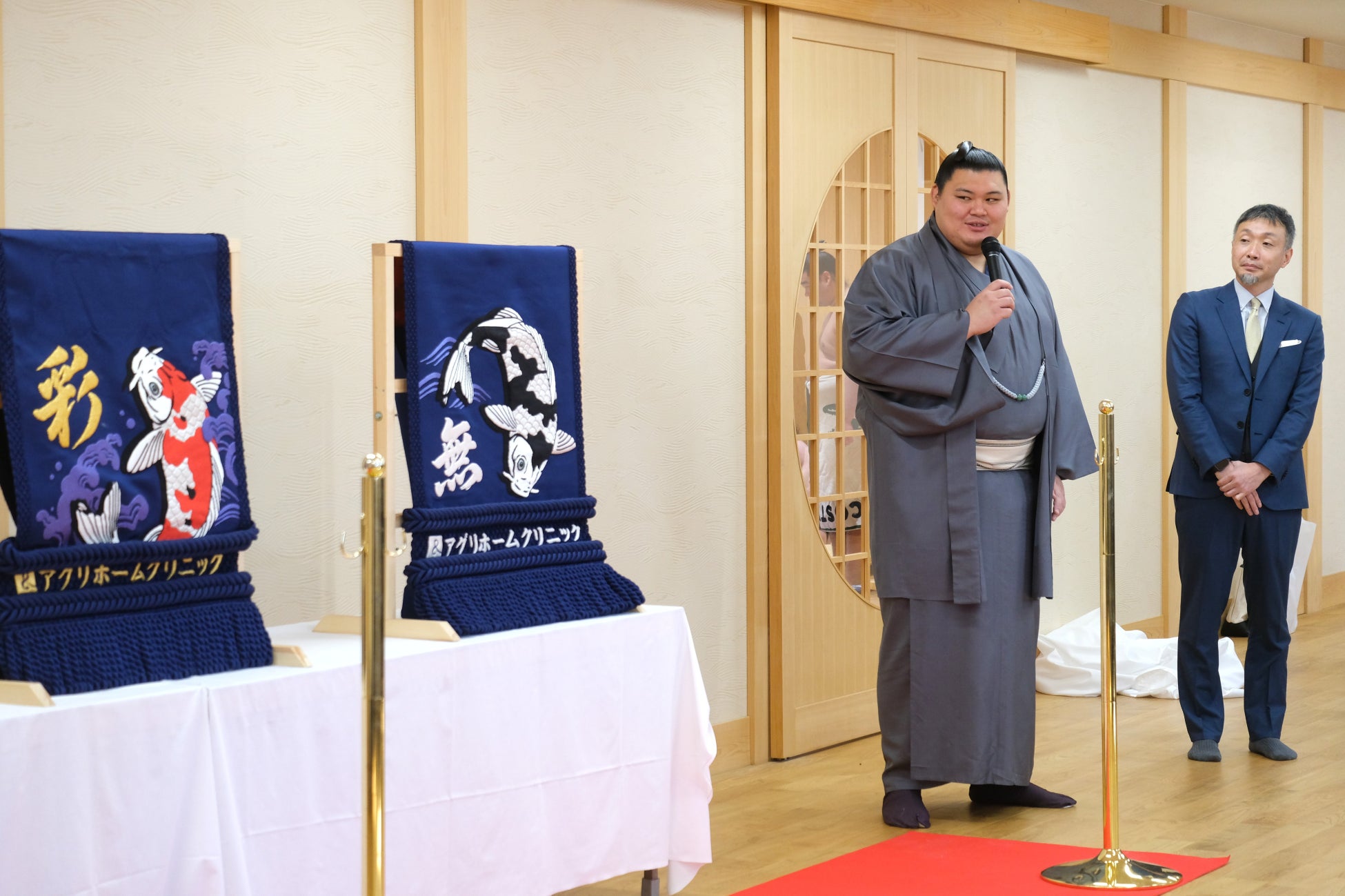 「この度は、医療法人AGRIE様より素晴らしい化粧まわしを贈呈いただき、誠にありがとうございます。新潟と茨城、私にとって大切な2つの地域を想い、デザインしていただいたこと、大変光栄に思います。24時間365日、地域の医療を支え続けておられる皆様の姿勢に、私自身も学ばせていただいております。この化粧まわしを締めて、横綱としての責任を果たし、地域の皆様に勇気と元気を届けられるよう、一番一番全力で土俵に上がります」
