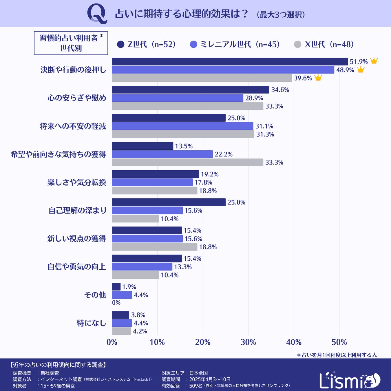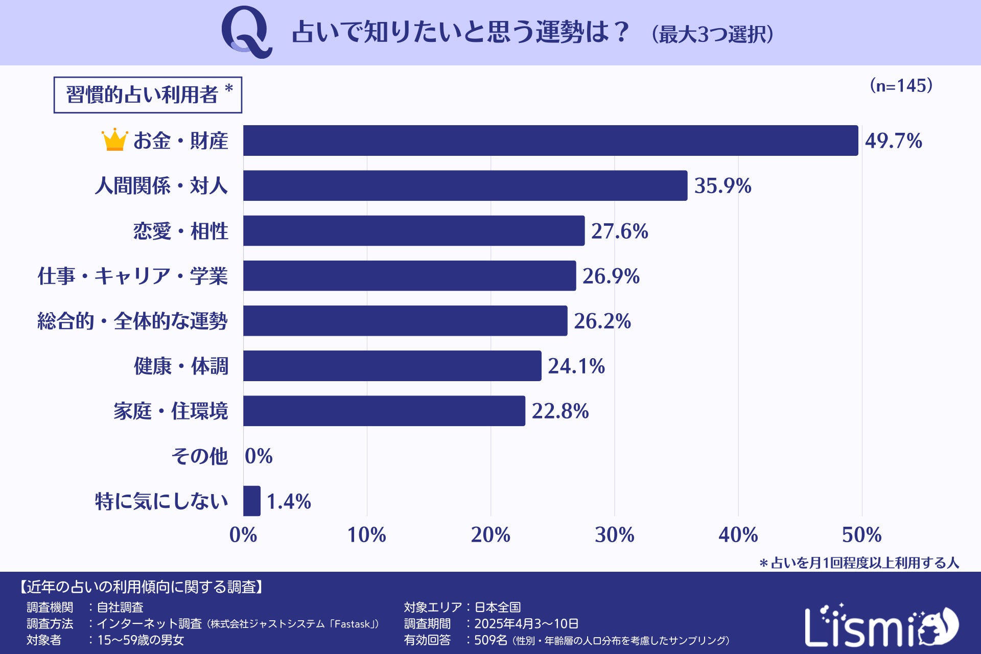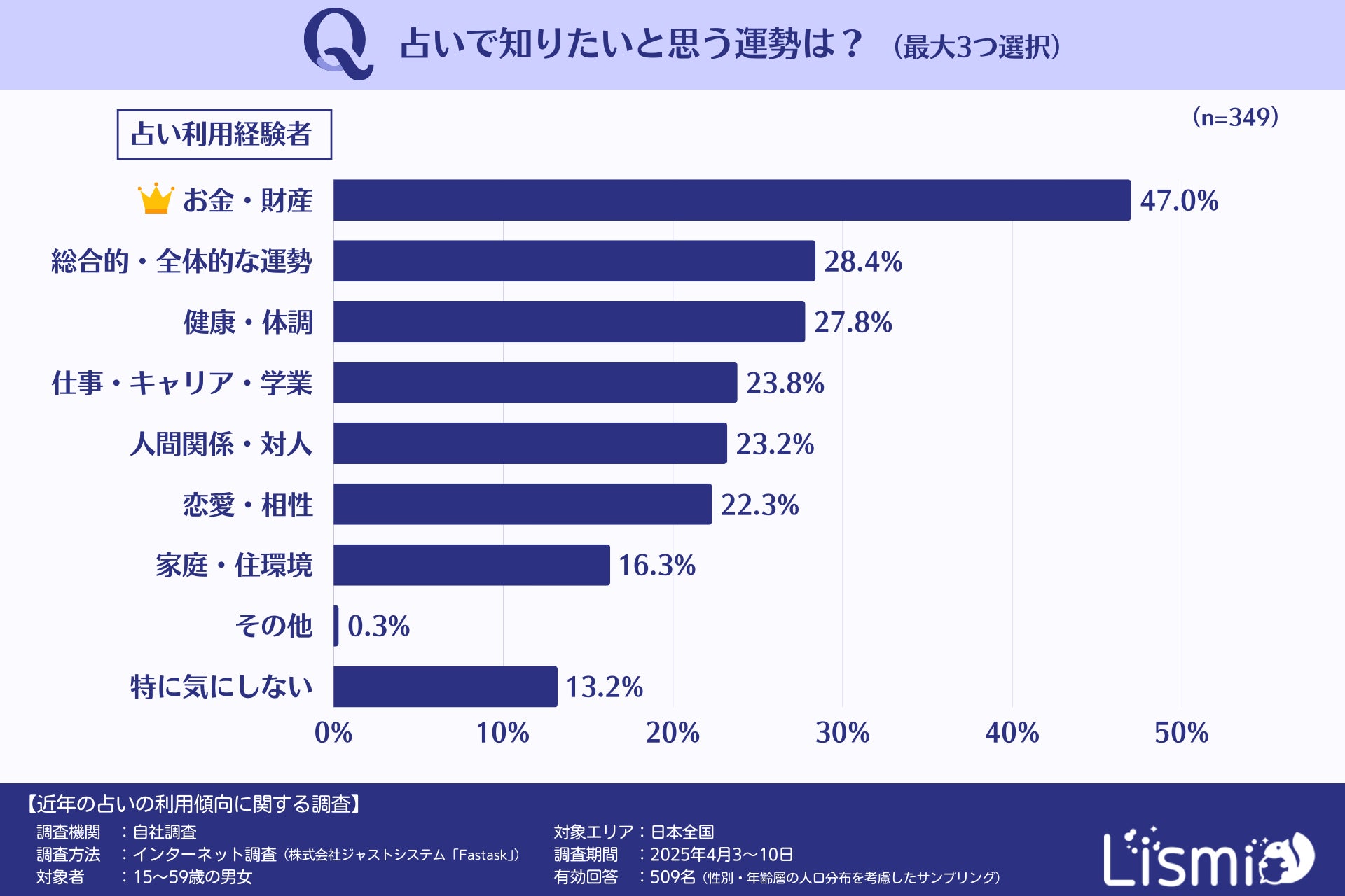 チャット占いアプリを提供する株式会社リスミィ( https://lismi.jp/ )(本社:大阪府大阪市、代表:池内康浩)は、近年、占いがどのように活用されているのか調査するため、15~59歳の男女509名を対象にアンケートを行いました。本調査では、Z世代を中心に占いへの関心が高まっており、お金や恋愛・人間関係に関する意思決定の後押しとして活用されていることがわかりました。