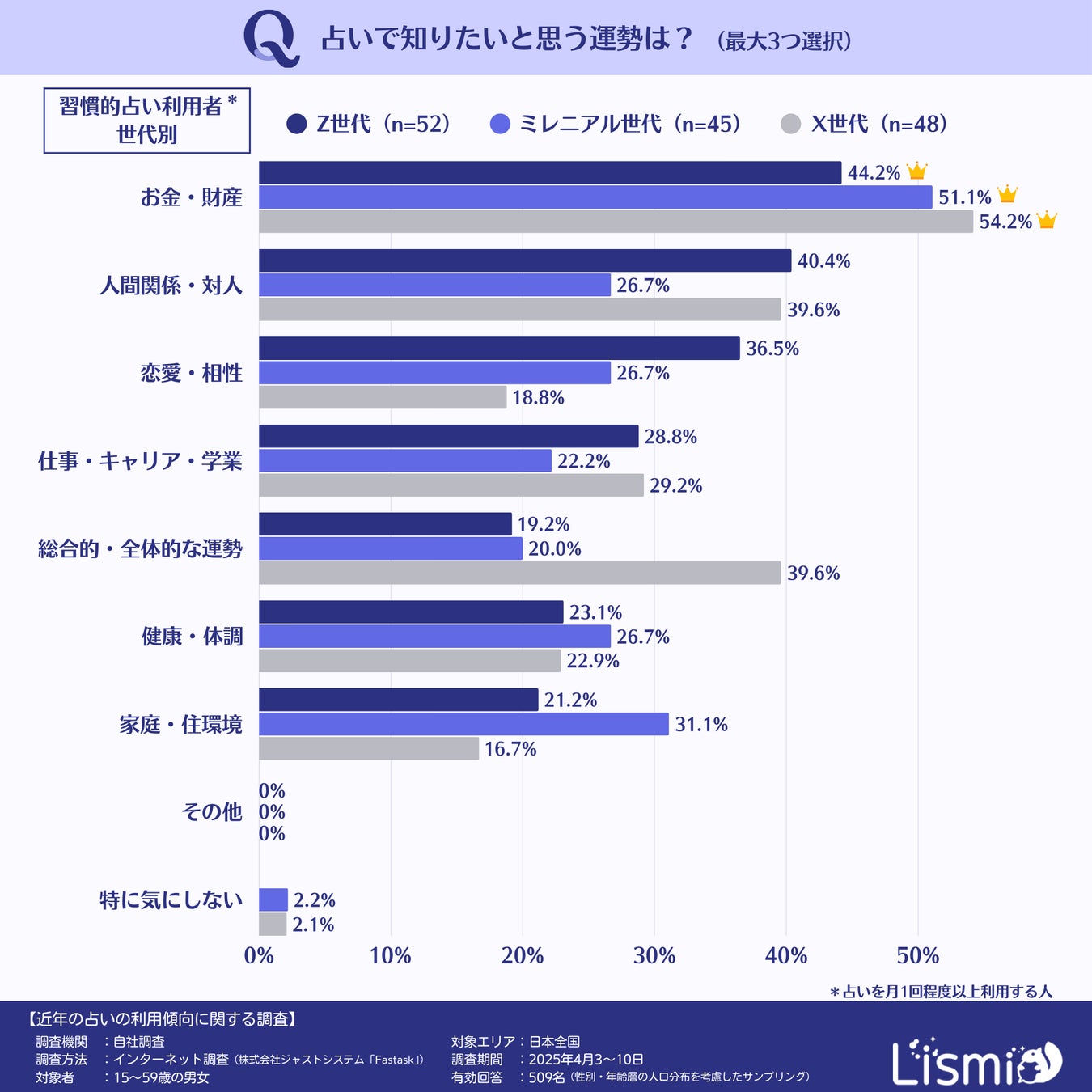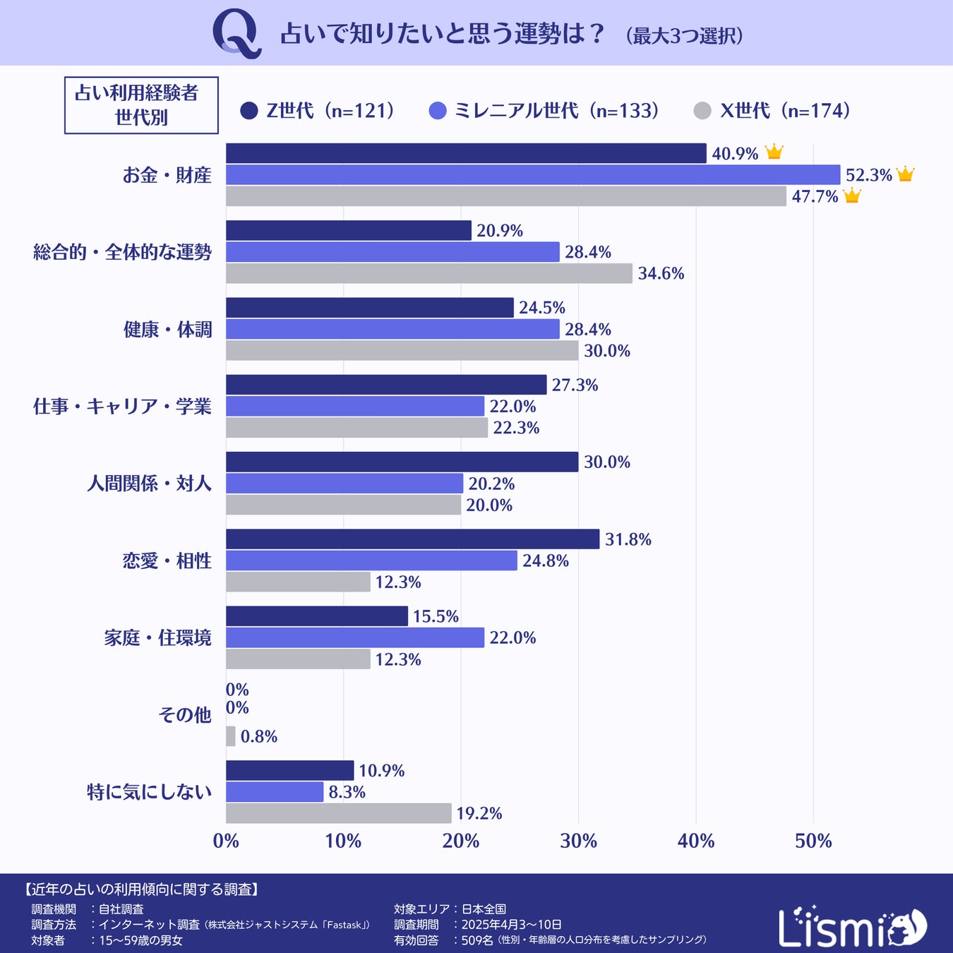 ミレニアル世代は「お金・財産」への関心が52.3%と3つの世代の中で最も高く、これに「健康・体調」「総合的・全体的な運勢」がともに28.4%で続いています。X世代で最も高いのは「お金・財産」で47.7%、これに「総合的・全体的な運勢」が34.6%、「健康・体調」が30.0%で続くという結果です。