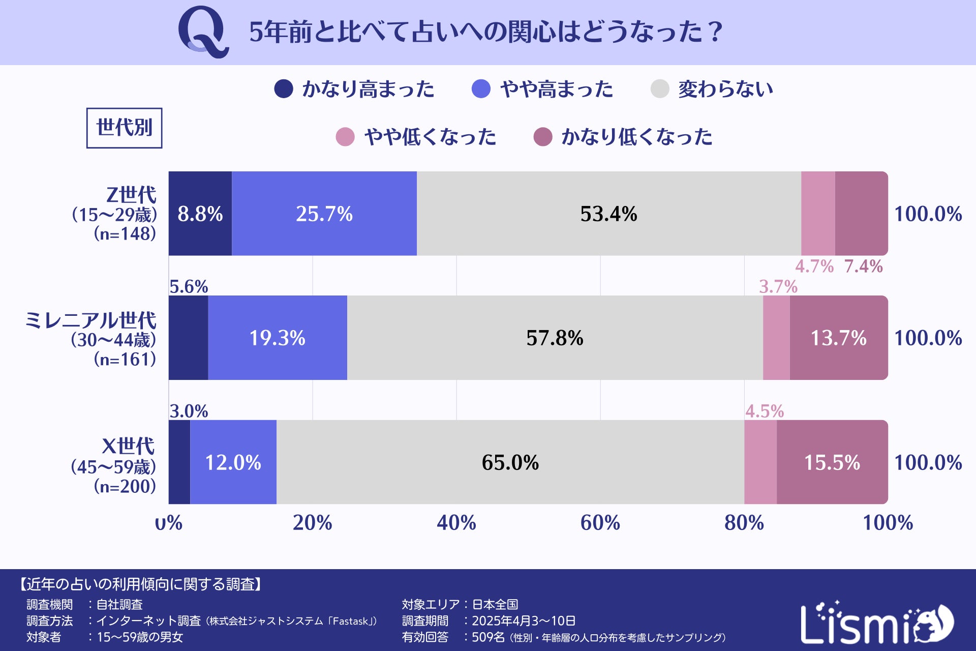 一方、X世代では関心が高まった人は15.0%にとどまっており、上の世代では占いへの関心がやや薄れていく傾向が見られます。