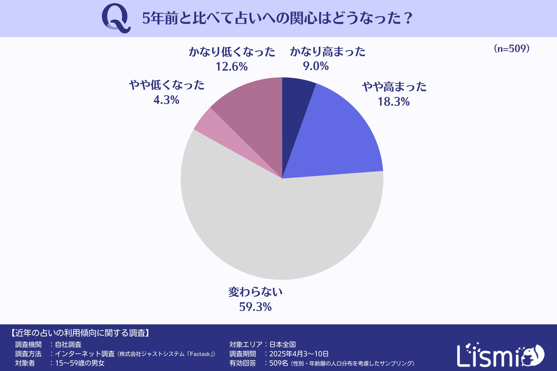 「変わらない」と回答した人が59.3%で最も多く、半数以上の人が占いに対する関心に変化はありませんでした。5年前と比較して関心に変化があったのは、残りの40.7%です。