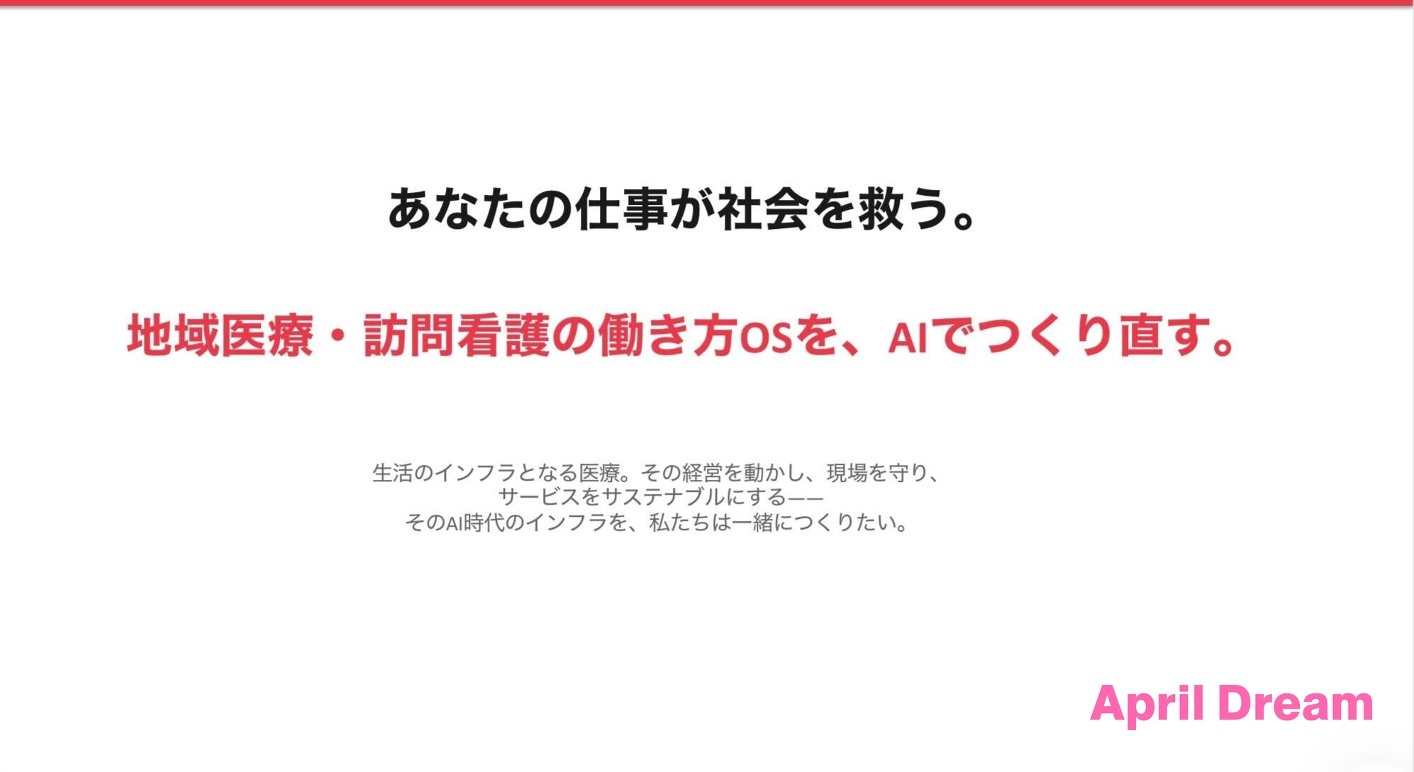 事業内容:訪問看護向けAIサービス(ホウカンAIオペ)の提供、地域医療の働き方OS開発