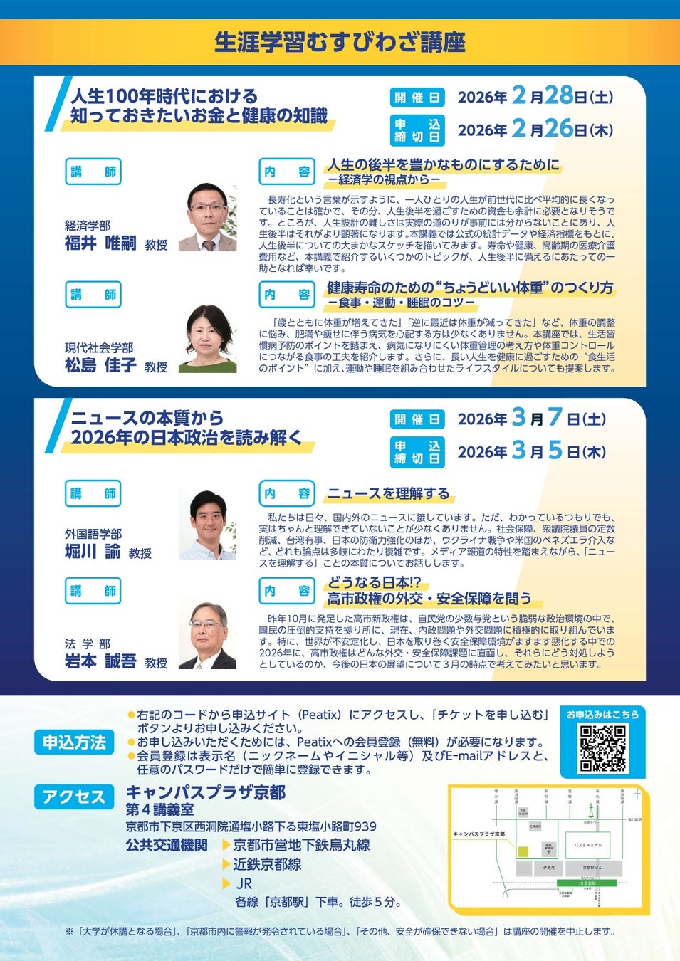 京都産業大学は、2026年2月28日(土)・3月7日(土)の2日間、市民の皆さまを対象とした「生涯学習むすびわざ講座」を開講します。