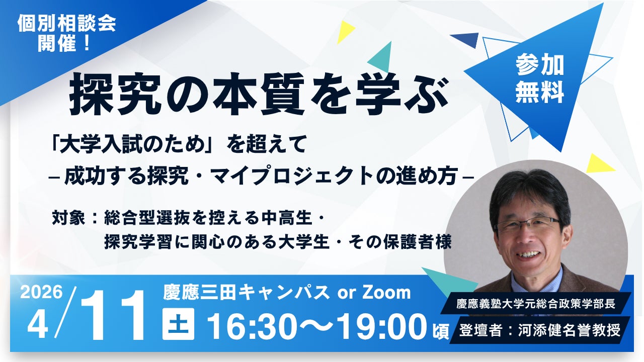 慶應義塾大学元総合政策学部長の河添健名誉教授をお迎えし、探究活動のあり方やその本質についてお話を伺う。探究学習や総合型選抜について個別相談会も実施。高校生必見。
