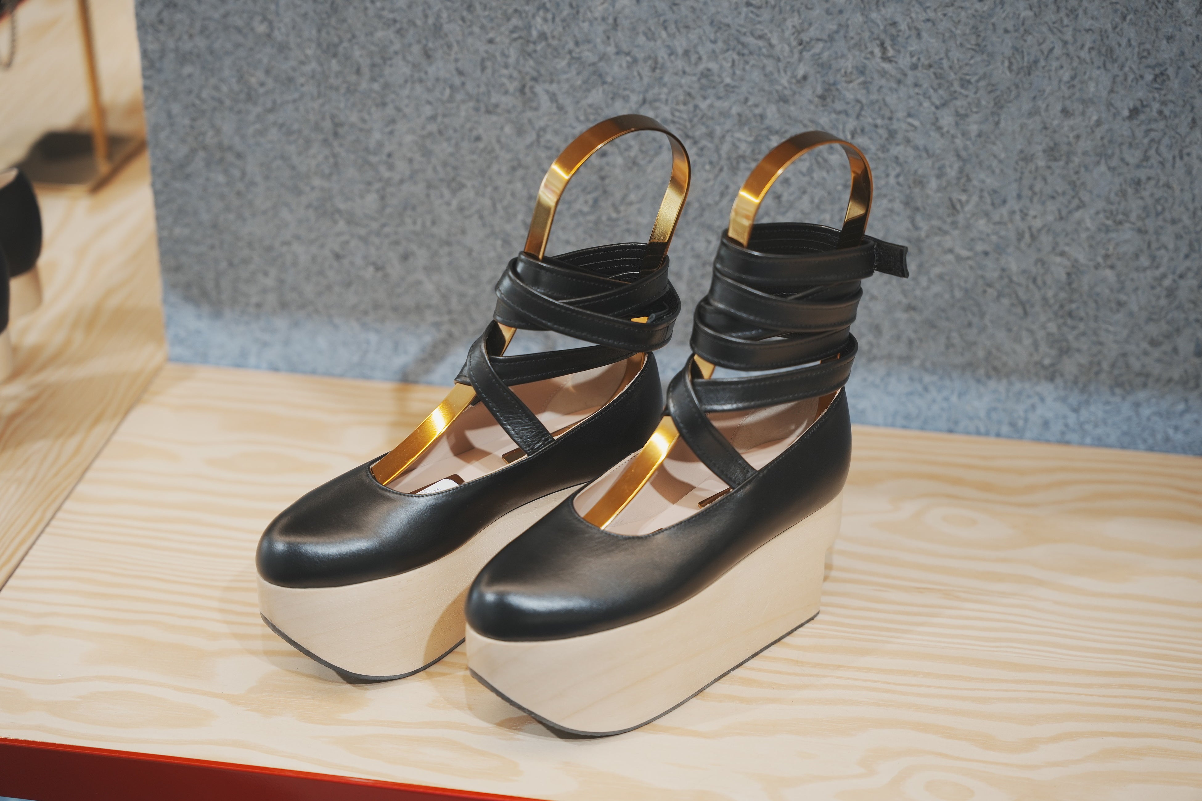 商品を展示しているディスプレイ棚は、ブランドを象徴するアイテム「ROCKING HORSE(ロッキンホース)」のウッドソール部分をイメージしたシルエットで、レッドカラーのテーブルがアクセントとなりプレイフルな雰囲気に。