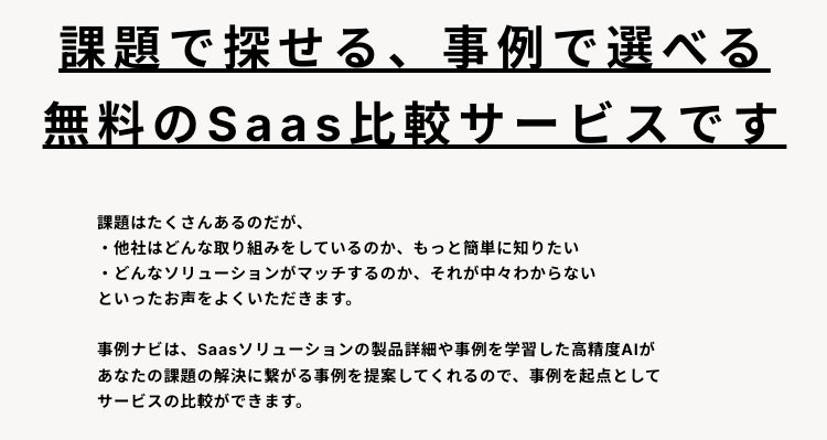課題から探せる、事例で選べる! ーー無料のAI × Saas比較サイト「事例ナビ」β版公開ーー