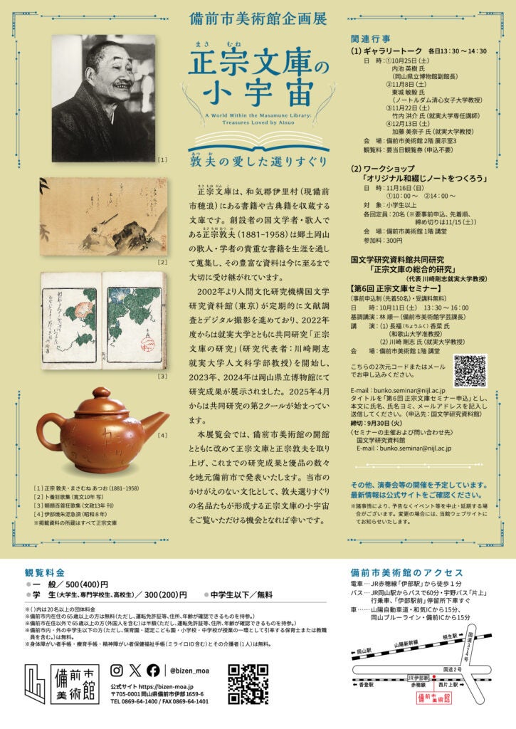 本展では、正宗文庫に収蔵される7千点、2万冊の資料から厳選し、江戸から明治・昭和にかけての古典籍や古地図、与謝野晶子・与謝野鉄幹ら文化人との交流を示す資料、人間国宝・金重陶陽の作品、正宗家兄弟ゆかりの品など、多彩な資料約40点を展示。正宗文庫の調査研究を長年進めてきた国文学研究資料館や就実大学による最新の研究成果を展示やトークイベントで紹介します。