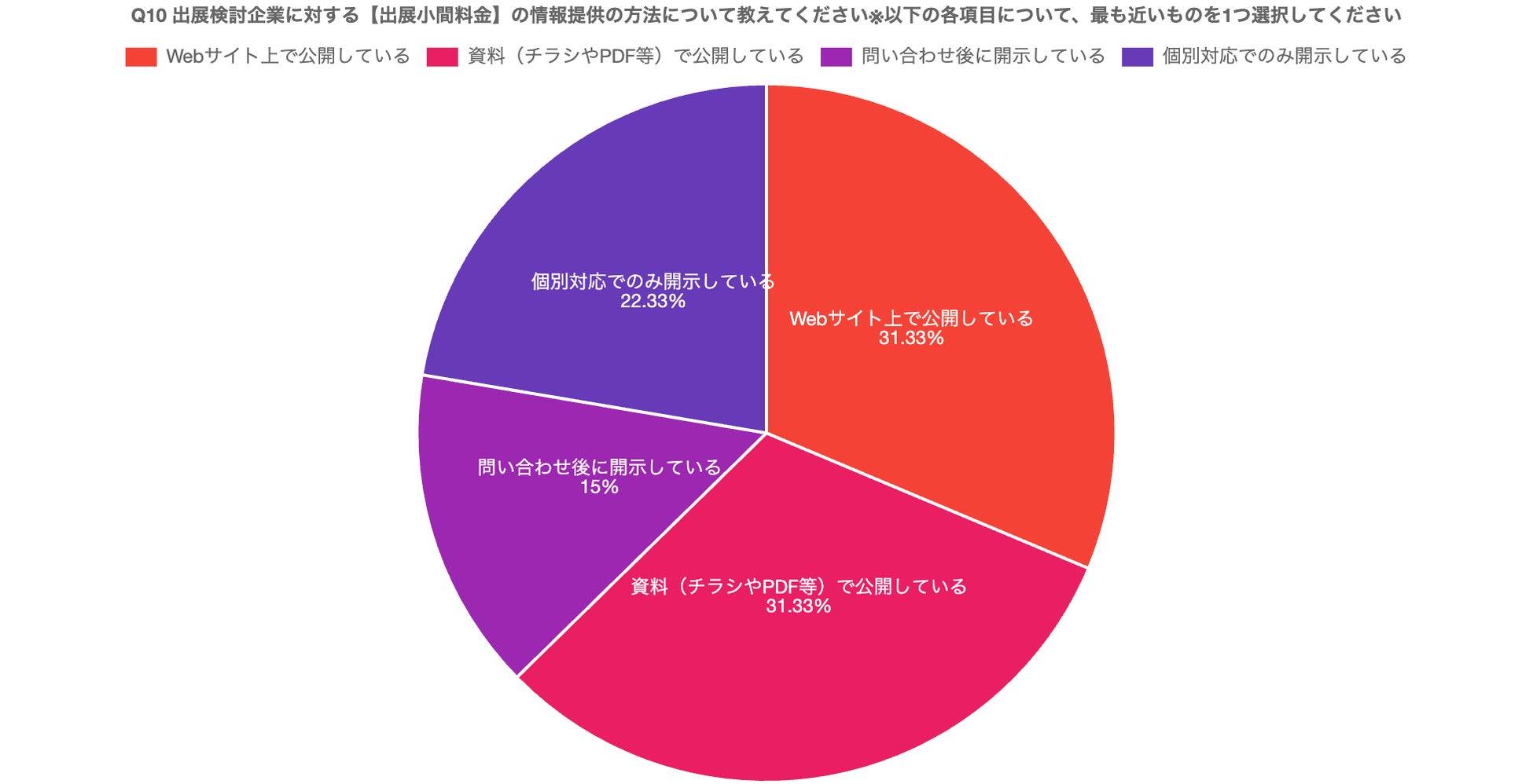出展検討に必要な情報については、「Webサイトで公開」「資料で一般公開」といった形式での提供が6割近く見られる一方で、「問い合わせ後に開示」「必要に応じて個別に開示」といった回答も少なくなく、情報提供の方法には多様なやり方で運用されていることが明らかになった。