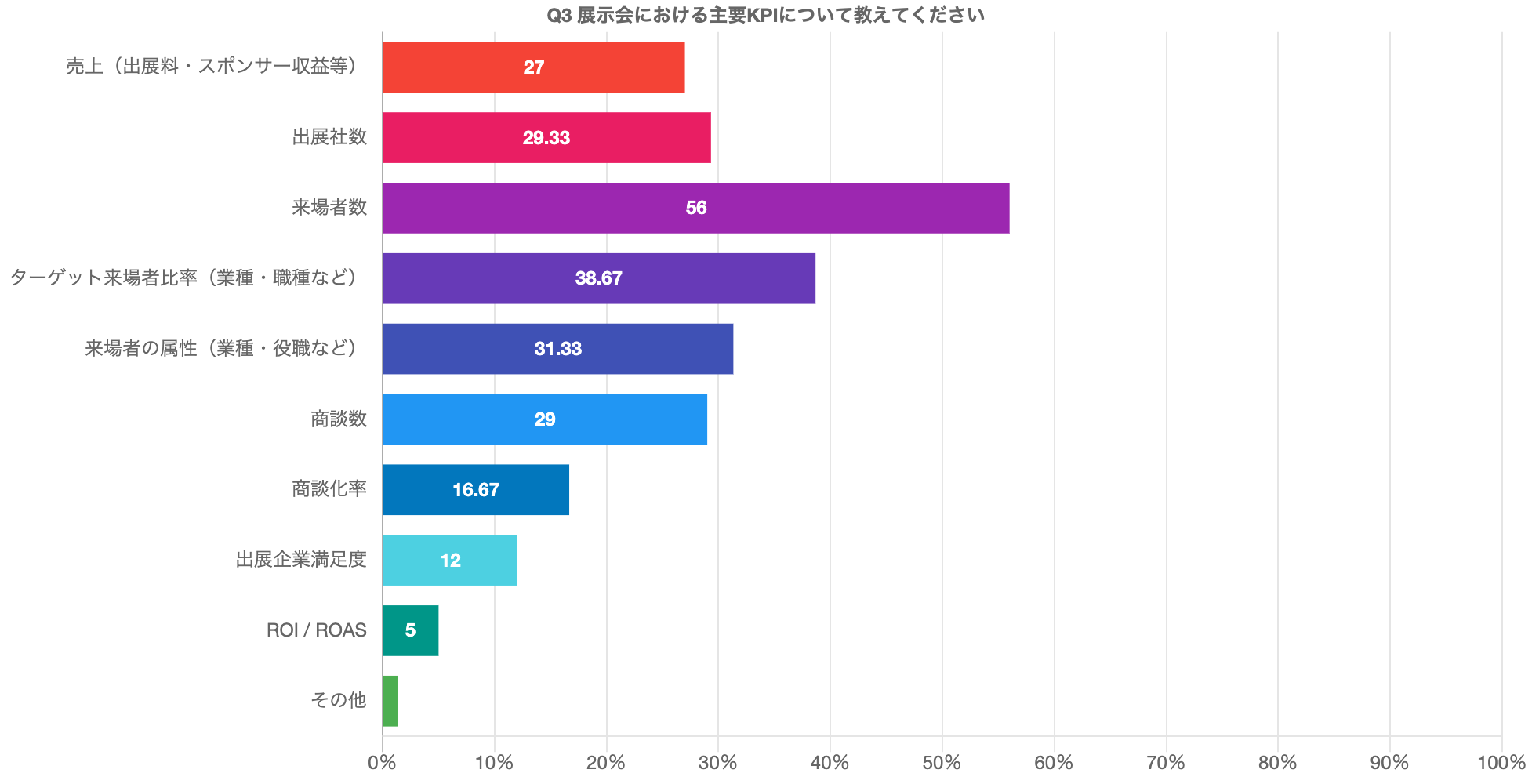 展示会運営において重視しているKPIについては、「来場者数」「ターゲット来場者比率」「来場者属性」といった指標が上位を占めた。