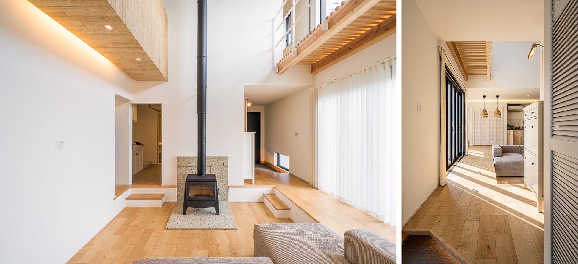 東北の厳しい冬でも家中が暖まるよう、家の中心に薪ストーブを設け、家族が集う暮らしをデザイン