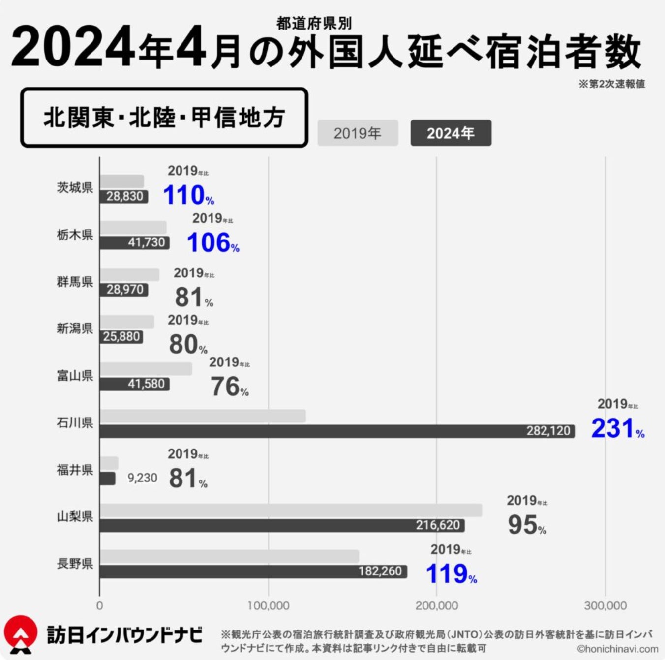 特に石川県では、外国人宿泊者数がコロナ前比で2倍以上に増加しており、グローバルな情報発信や多言語対応の重要性が一層高まっています。