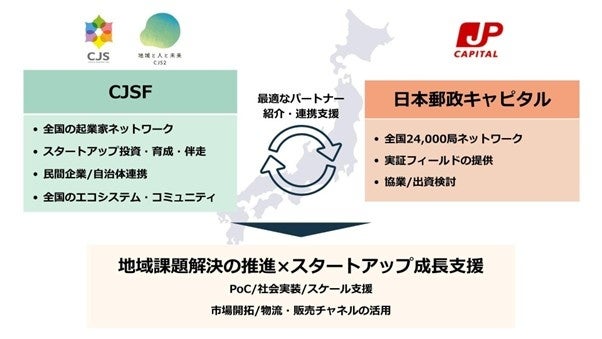 本連携により、CJSFが接点のある地域の課題解決に取組む起業家や事業者から最適なパートナーを紹介・連携支援を実施。日本郵政キャピタルは日本郵政グループの全国約2万4千の郵便局ネットワークを活用し、具体的な協業や出資を検討していきます。今後も両社は、地域の課題解決とスタートアップの成長支援を両輪で実現する、地域にフォーカスした新たなコミュニティ連携を実施してまいります。
