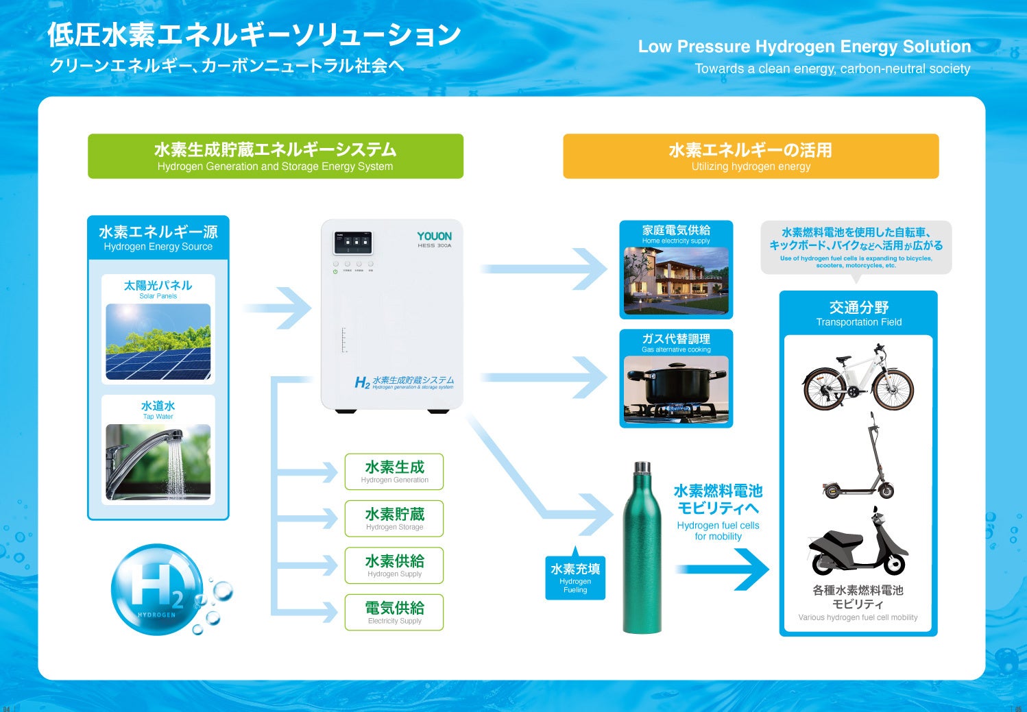 YOUON JAPANでは、**「太陽光と水があれば水素が生まれる」**をテーマに、水素生成・貯蔵・活用を一体化した独自システムを開発。