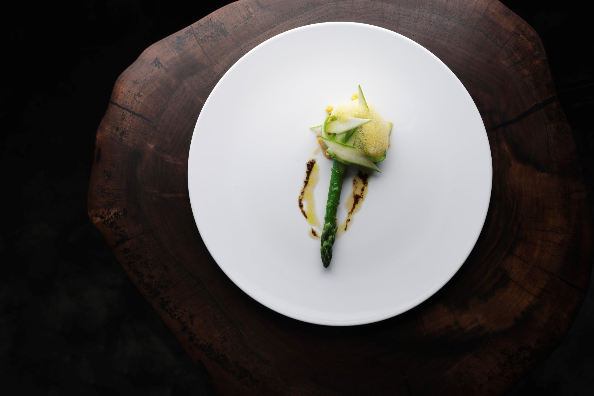 北海道のアスパラ専門農家ジェットファームの長谷川博紀氏が育てたアスパラガスを、1本で“味のグラデーション”として楽しむひと皿です。手前の穂先で素材そのものの瑞々しさを味わい、奥へ進むにつれて薄くスライスした根元部分へ。甘み・旨み・香りが凝縮した根元は、ほやのリゾットと重ね、パッションフルーツのバブルソースで香りを立たせました。上質な素材を、確かな技でより複雑な一品へ高める、レストランの姿勢を象徴する料理です。