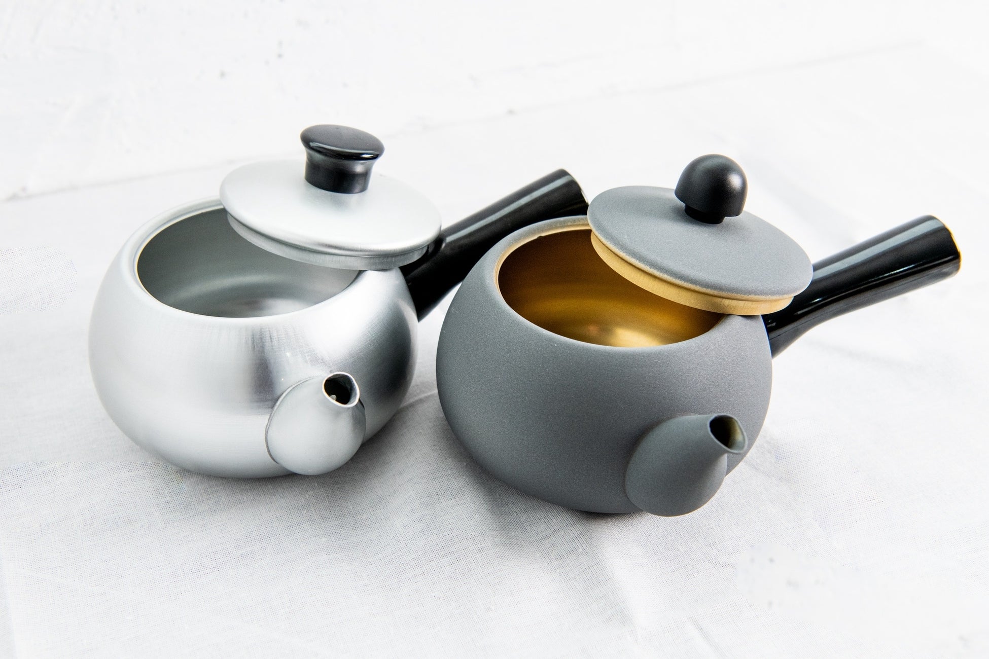 片側が蓚酸アルマイト(ゴールド色)で片側が梨地のグレー系アルマイト(石や陶器のような雰囲気)。