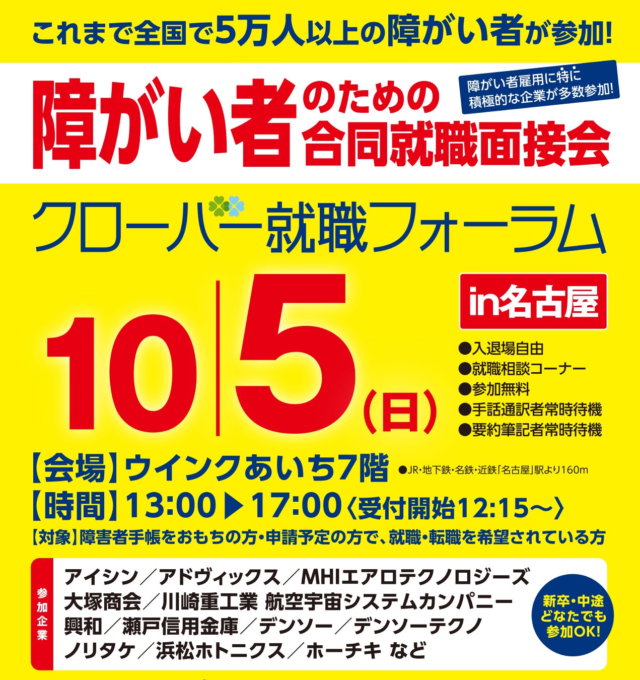 10/5(日)に障がい者のための合同就職面接会クローバー就職フォーラムを名古屋で開催いたします。