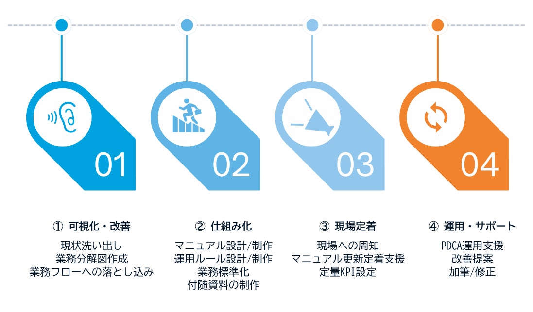 ・可視化・仕組み構築・定着・運用改善の4フェーズで、属人化や非効率を根本から解消し、仕組みが文化として根づく組織づくりをサポートします。