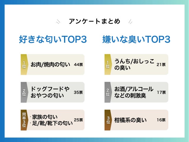 ただ柑橘系のニオイに関しては、好きな匂いとしても一定数票を集めており、好みが分かれることが分かりました。