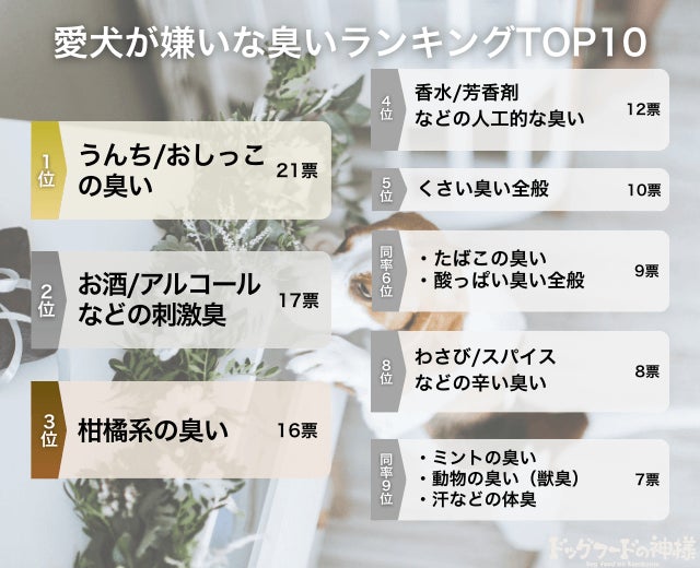 嫌いな臭いランキング1位は「うんち/おしっこ」。キレイ好きな性質からか、排泄物の臭いに敏感な犬が多い。また、アルコールなどの刺激臭も不人気。