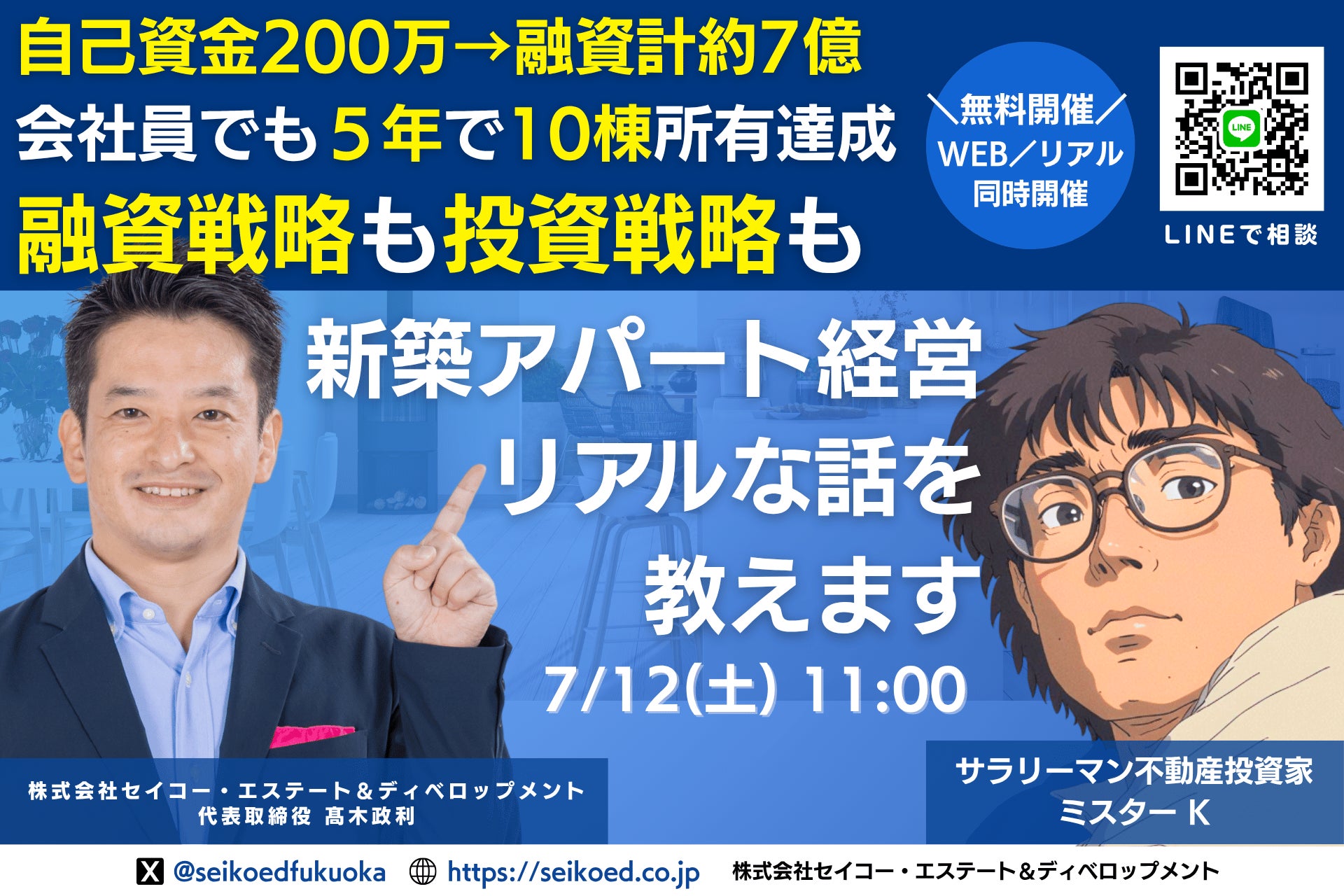 福岡で不動産投資・新築アパート経営を始めたい方は参加必須。不動産投資家の目線で土地仕入れから、1から10まで伴走するセイコー・エステートが無料セミナーを2025年7月12日に開催。