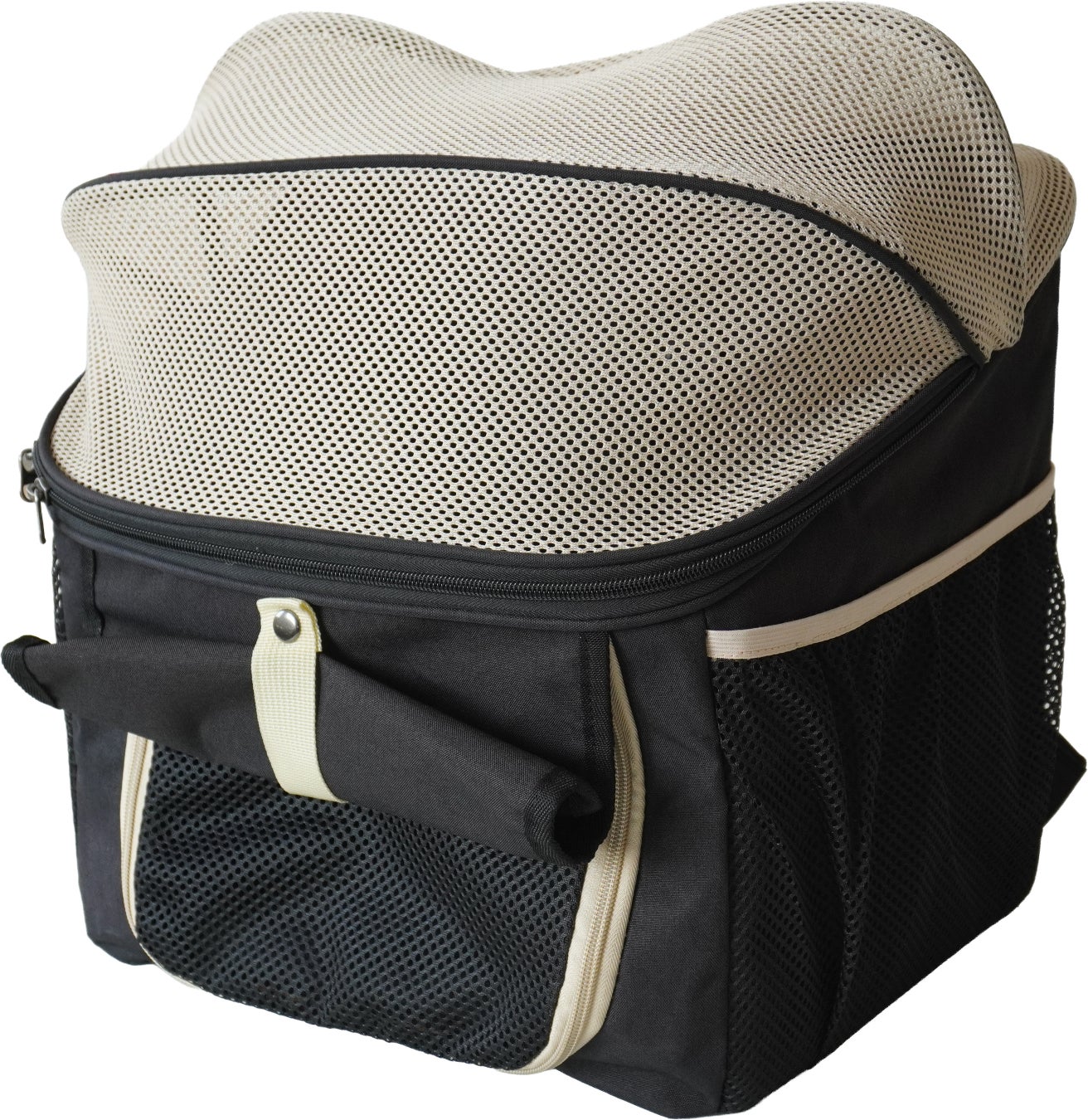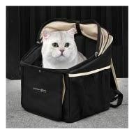 バッグ本体は耐久性の高いオックスフォード生地+PVC製で、雨や汚れにも強くアウトドア利用に適しています。重量約1.8kgと軽量ながら耐荷重は約9kg、小型犬や猫などのペットを安心して乗せることができます。内部はペットが快適に過ごせるクッション材入りで、通気性を確保しながらペットが景色を楽しめるメッシュ窓やドーム型小窓も備えています。