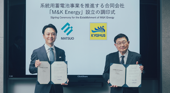キグナス石油株式会社(本社:東京都千代田区、代表取締役社長:若澤 雅博|以下、キグナス)と松尾産業株式会社(本社:大阪府大阪市、代表取締役社長:松尾 尚樹|以下、松尾産業)は、系統用蓄電所を共同で運営する合弁会社「合同会社M&K Energy」を設立することで合意し、2026 年4月9日に調印式を行いました。
