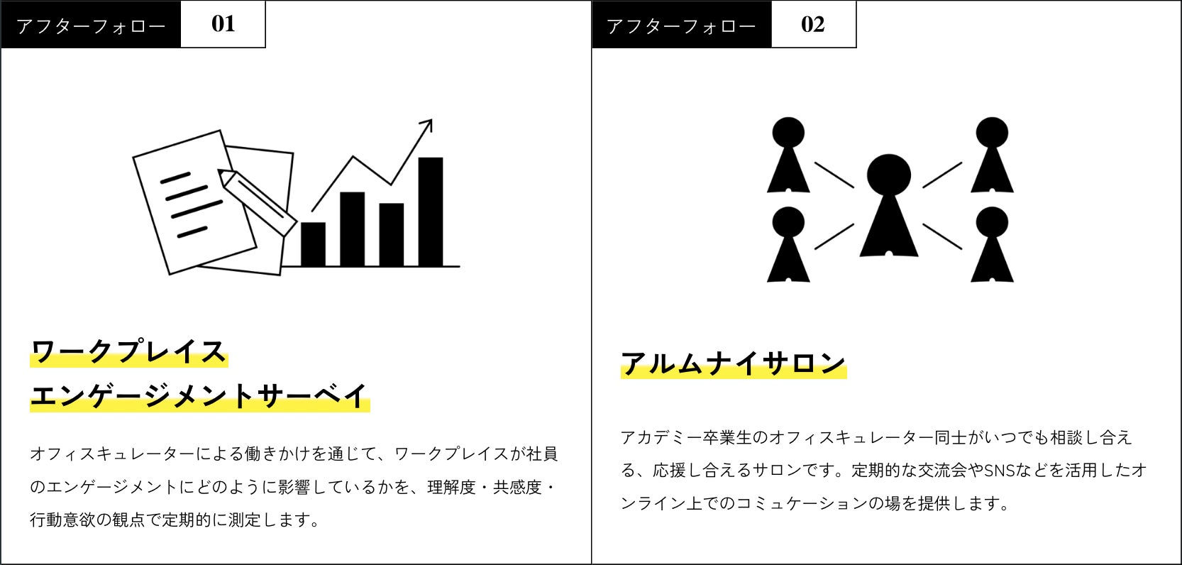 オフィスキュレーター起用による効果測定が可能なサーベイの提供と、卒業生同士による交流機会の創出により、アカデミー修了後も伴走支援します。