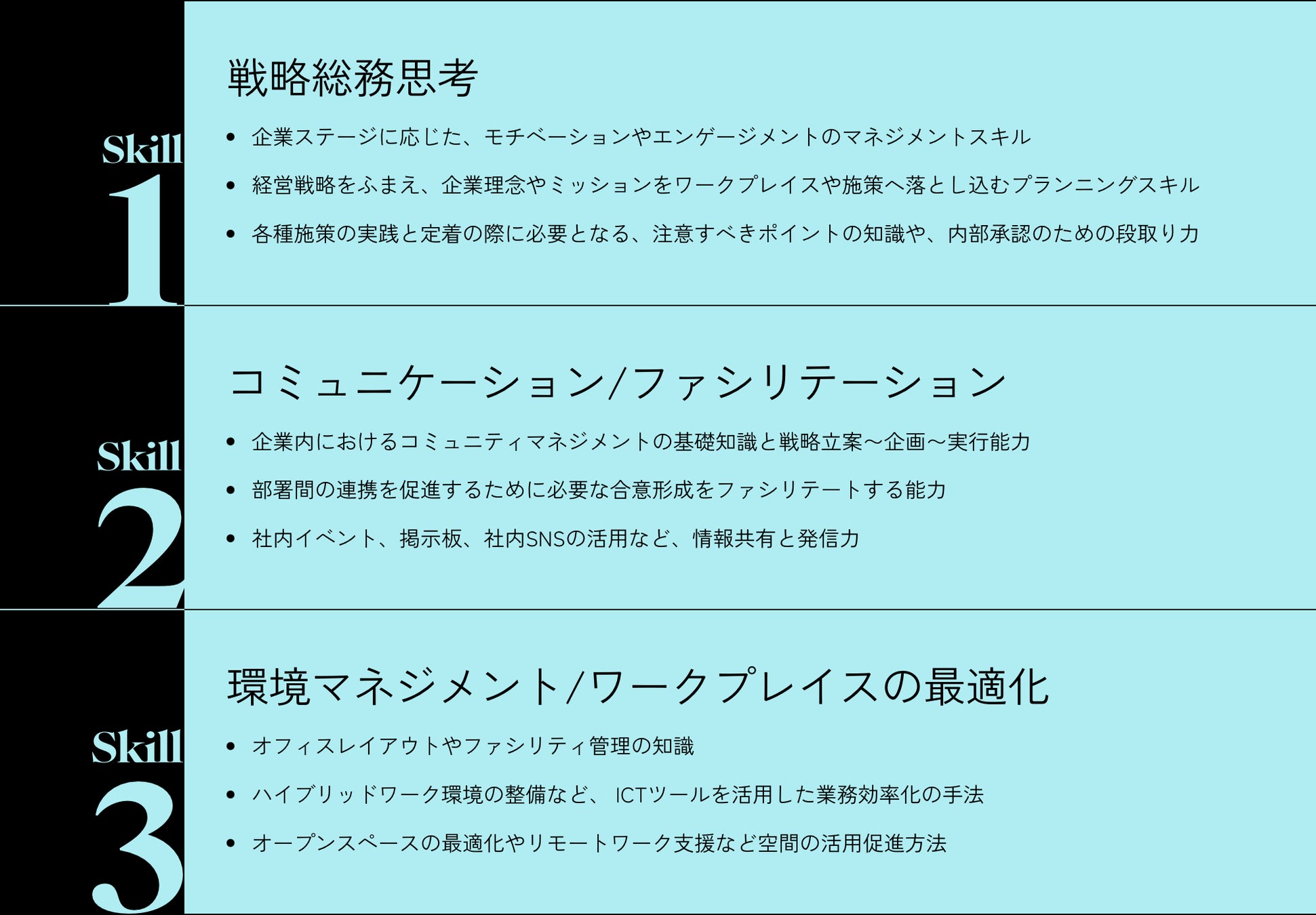 オフィスキュレーターは、ワークプレイスを上手に活かして、社員のエンゲージメントを高め、組織に活気を生み出す戦略的な役割を担っています。そのために必要な能力を以下の3つに分類し、カリキュラムを設計しました。