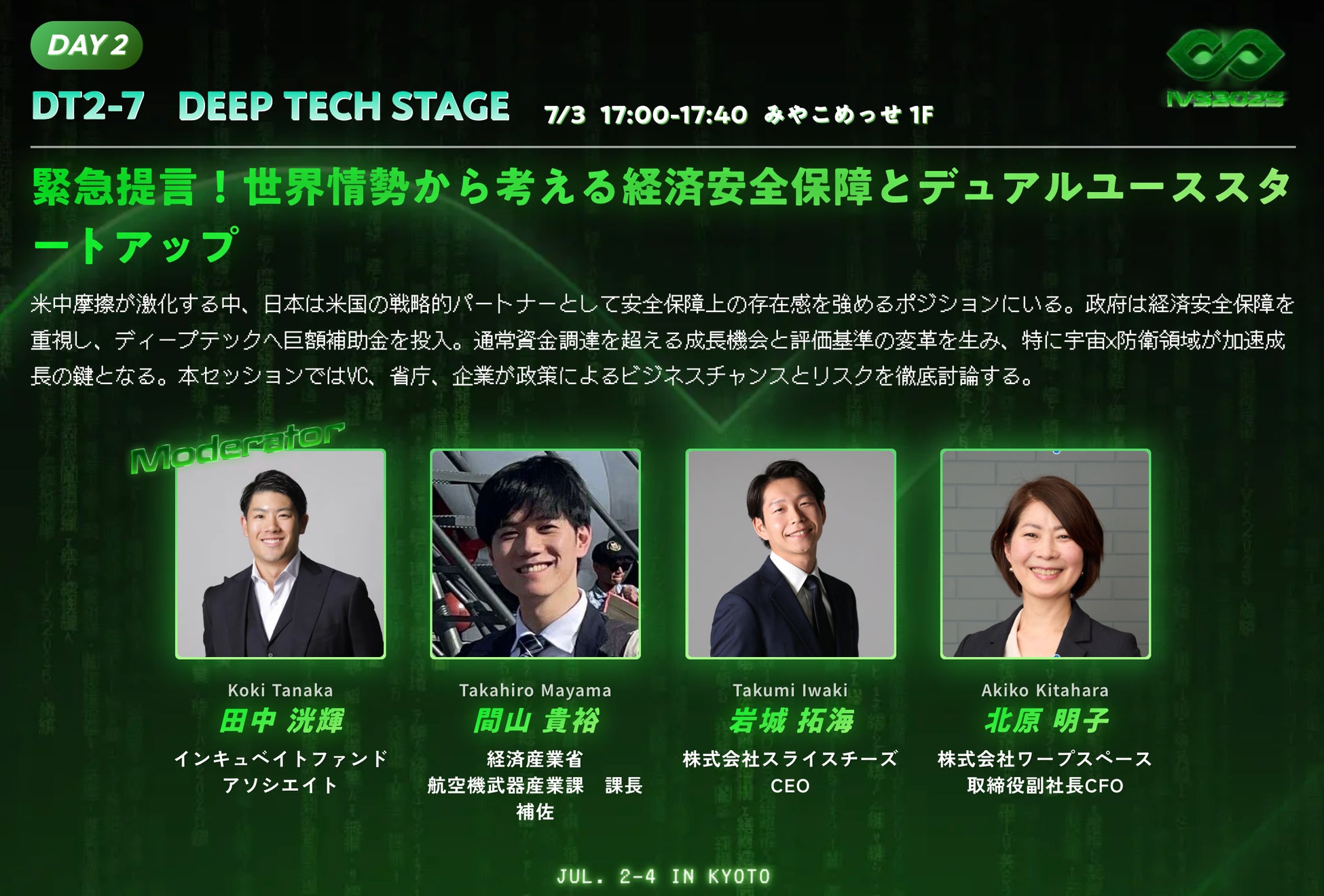 株式会社スライスチーズ(本社:東京都港区、代表取締役:岩城拓海、以下「スライスチーズ」)は、2025年7月3日(木)に京都・みやこめっせで開催された日本最大級スタートアップカンファレンス「IVS2025 Kyoto」のDay2公式セッション「緊急提言!世界情勢から考える経済安全保障とデュアルユーススタートアップ」に登壇しました。