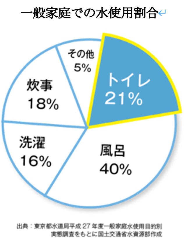 生活に必要とされる水の21%はトイレ、お風呂は40%を占めています。
