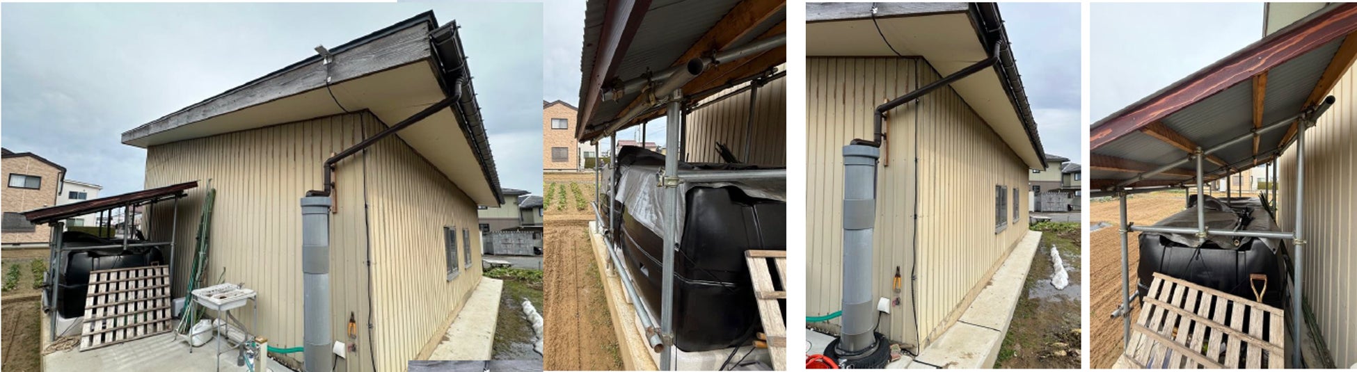 畑への散水を目的として雨水を利用している。2400Lを貯水でき、遠隔監視も可能。