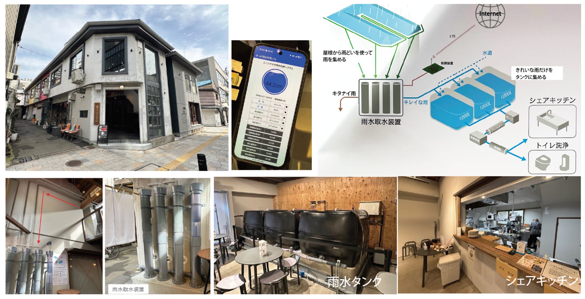 コノジナガヤ雨水(あまみず)プロジェクトでは、最新鋭の雨水利用システムで屋根に降ったキレイな雨水だけを3600L (タンク3つ)のタンクに溜め、飲用レベルに水質を高めてシェアキッチンやトイレ洗浄に利用。IoTによる制御システムで雨水の量を監視し、遠隔制御も可能。常時1日で約200L〜300Lの雨水がトイレの洗浄などに利用されている。
