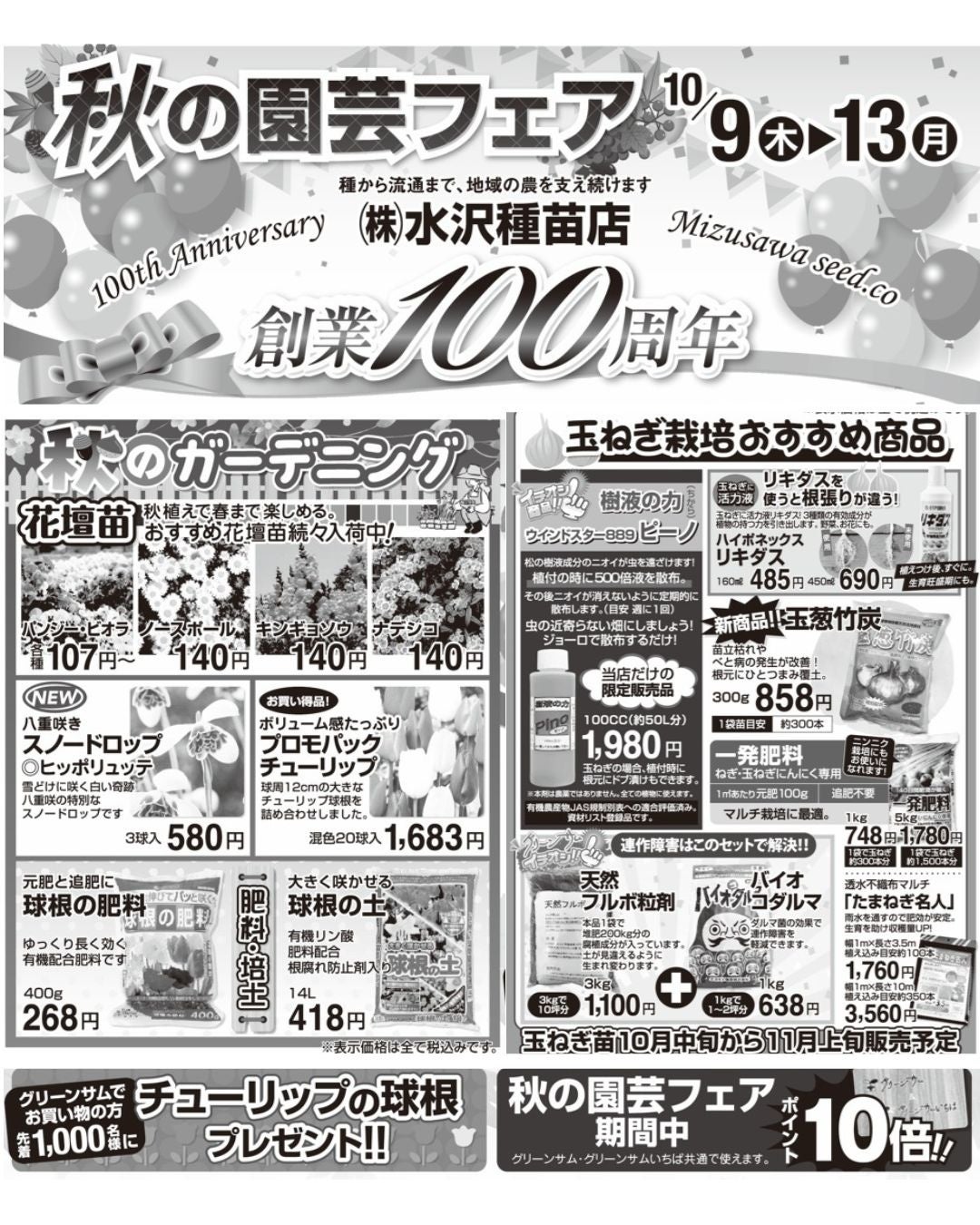 創業100周年を迎える株式会社水沢種苗店(本社:宮城県石巻市、代表取締役:水澤長之)が運営する園芸専門店「グリーンサム」では、2025年10月9日(木)から10月13日(月・祝)までの5日間、「秋の園芸フェア」を開催いたします。