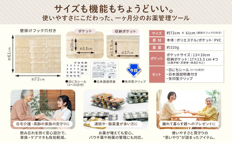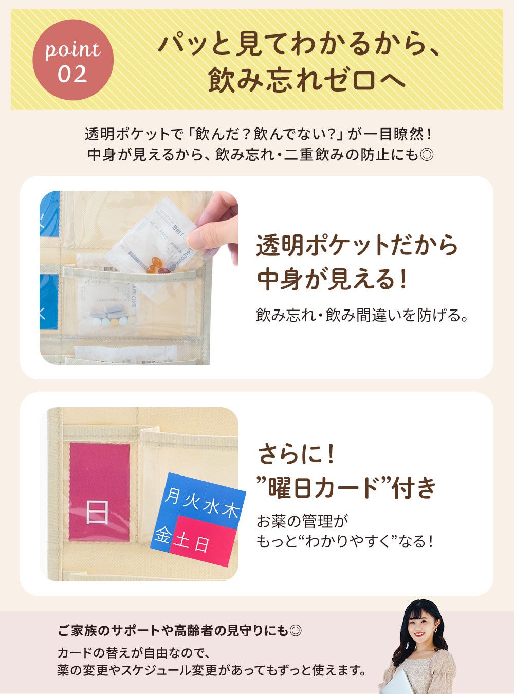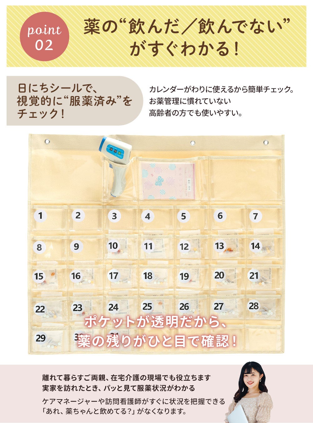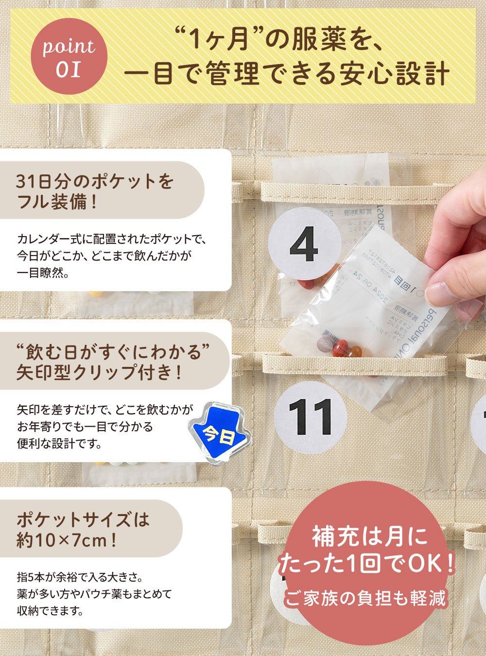 ・1日1ポケット×31日分の大容量クリアポケットで、服薬の「見える化」を実現。