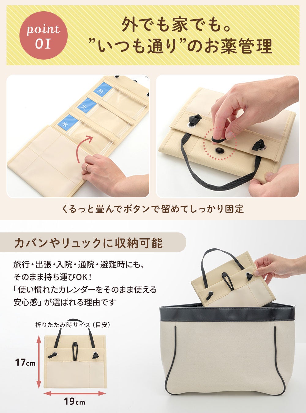 ・旅行や外出時はもちろん、通院・入院・避難時にも役立つ折りたたみタイプの服薬カレンダー。