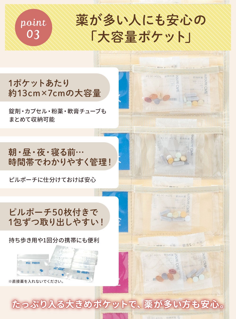 ・1回分ずつ小分けできる「ピルポーチ」50枚付きで、服薬準備がよりスムーズ。