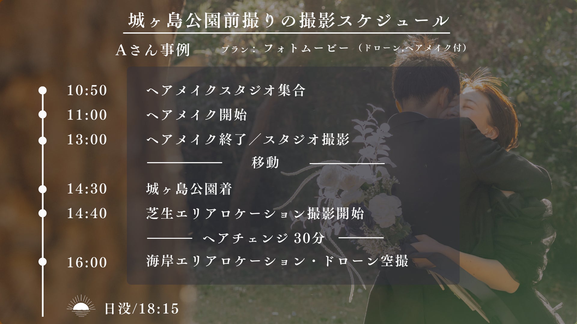 スタジオ集合後にヘアメイクを整え、スタジオで所作や小物の写真を収録。午後は城ヶ島公園へ移動し、まず芝生エリアで家族写真や衣装の動きを柔らかな光で撮影。続いて海岸へ移動し、水面の反射と水平線の広がりを活かして写真+ドローンで仕上げます。全体を同一トーンで編集し、一日の物語としてまとめます。