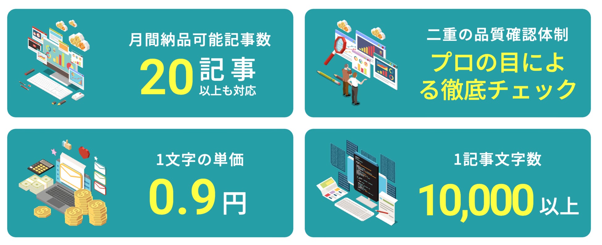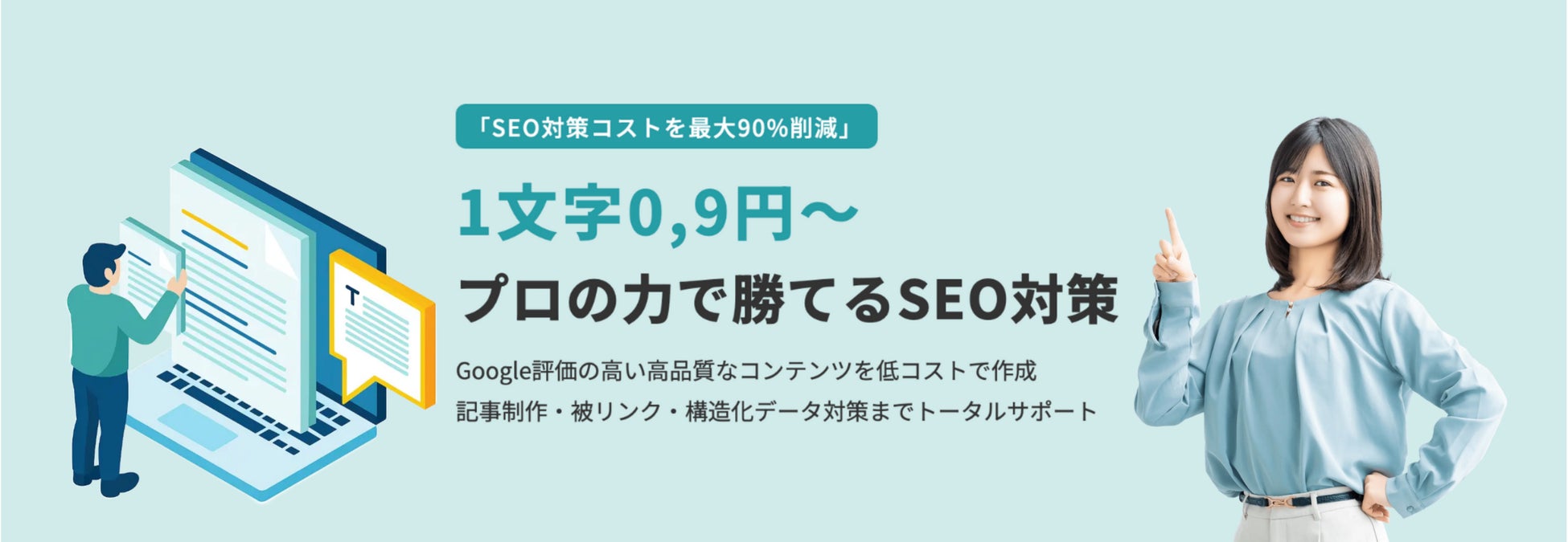 業界最安値水準の「1文字0.9円~」を実現 高品質なSEO対策を、より多くの企業にご利用いただくため、徹底した効率化により業界最安値水準となる「1文字0.9円」からの価格設定を実現しました。外注コストを最大90%削減(※当社調べ)することも可能で、予算の限られる中でも本格的なSEO対策に着手いただけます。