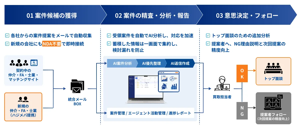 これにより、M&Aの買い手担当はコア業務であるM&A案件分析・社内調整・対外交渉に注力できるようになり、M&Aの成功確度向上を促します。