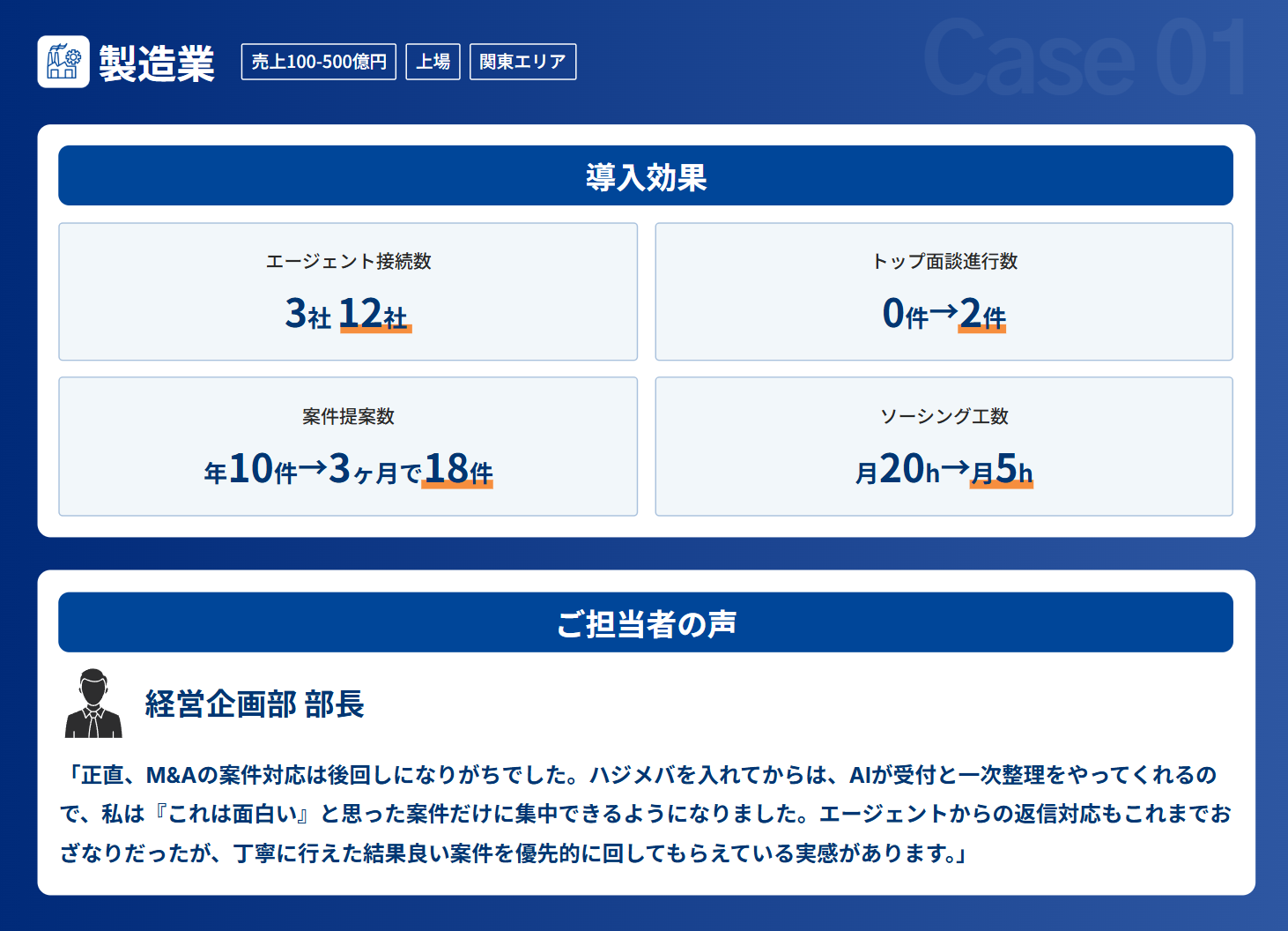 従来、新規のM&Aエージェントの開拓には各社ごとに数週間のリードタイムがかかっていましたが、本機能により即日でソーシング網を拡大できます。M&Aエージェントにとっても、ハジメバを通じて新たな買い手企業と接点が持てるため、双方にメリットのあるネットワーク構造を実現しています。