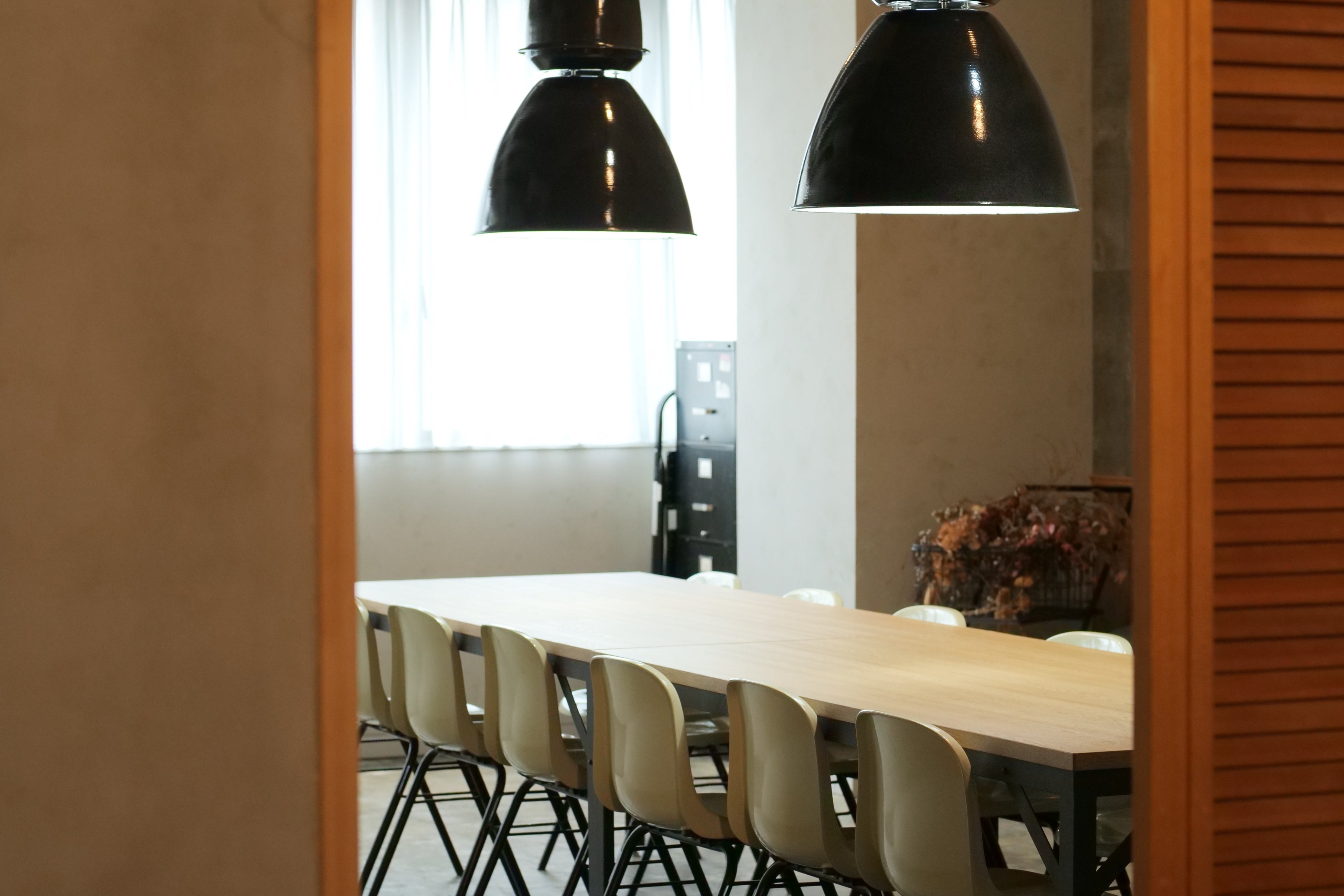 シンプルで洗練されたデザインの会議室は、落ち着いた照明と静かな環境で集中しやすい空間です。大きなテーブルとチェアを備え、社内ミーティングやプレゼンテーション、ワークショップなど幅広くご利用いただけます。