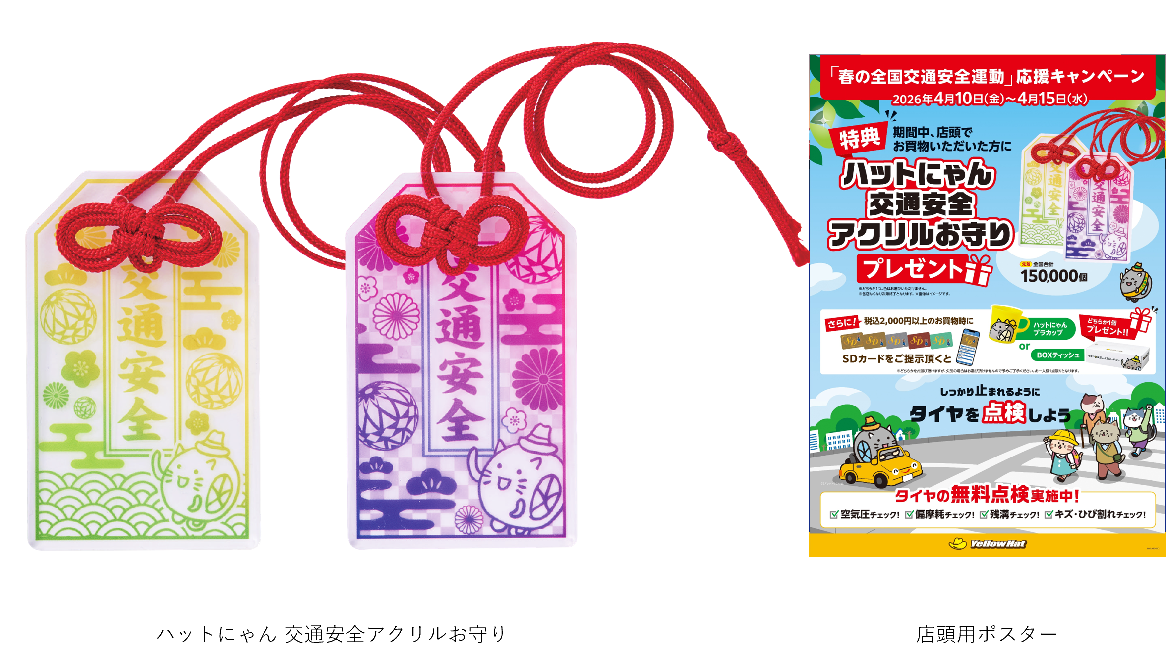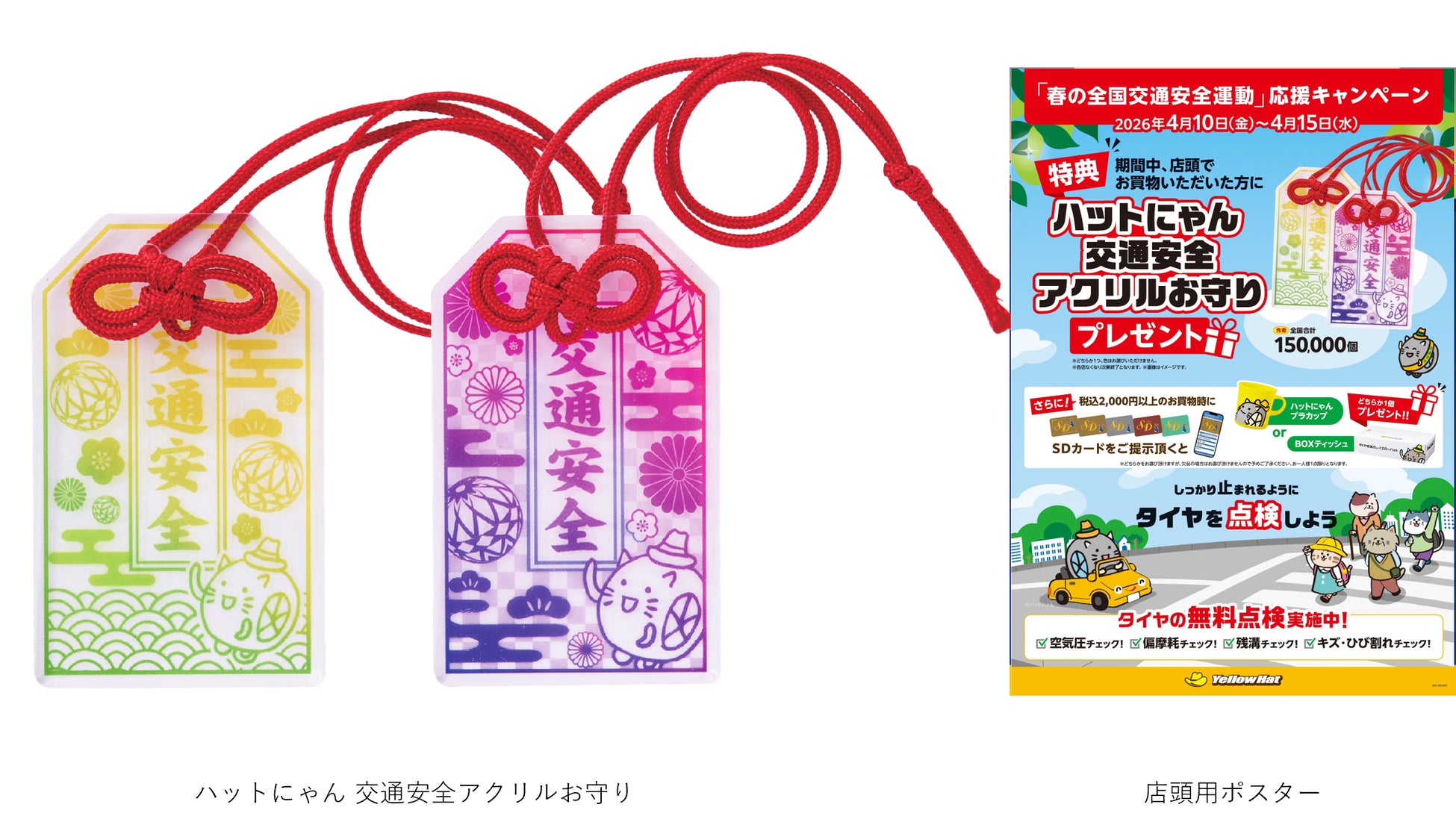 また、イエローハット全店舗において、お買い物いただいた方に「ハットにゃん 交通安全アクリルお守り」をプレゼントする店舗キャンペーンを2026年4月10日(金)から15日(水)まで実施いたします。