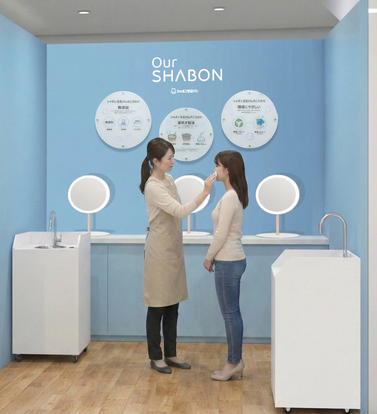「Our SHABON」シリーズのタッチアップコーナーでは、「純せっけん洗顔」「シャボン玉 素肌化粧水」「シャボン玉UV」を、その場で実際にお試しいただけます。ショップスタッフとのコミュニケーションを通じて、ブランドや商品の魅力はもちろん、シャボ