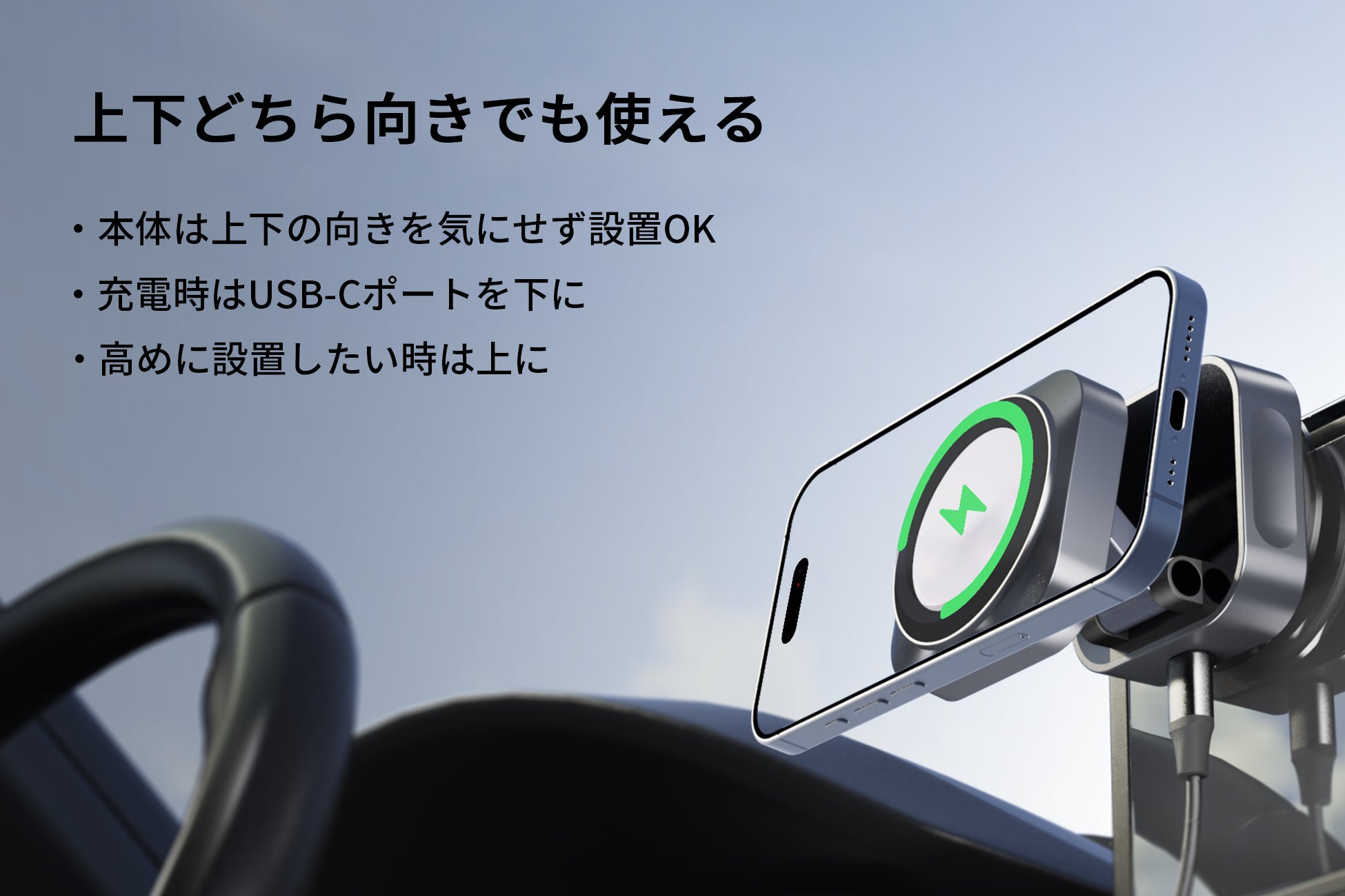 マグネットホルダー機構により、スマホをピタッとくっ付けるように装着。ワイヤレス充電対応スマートフォンと組み合わせることで、最大15W相当の給電が可能です。