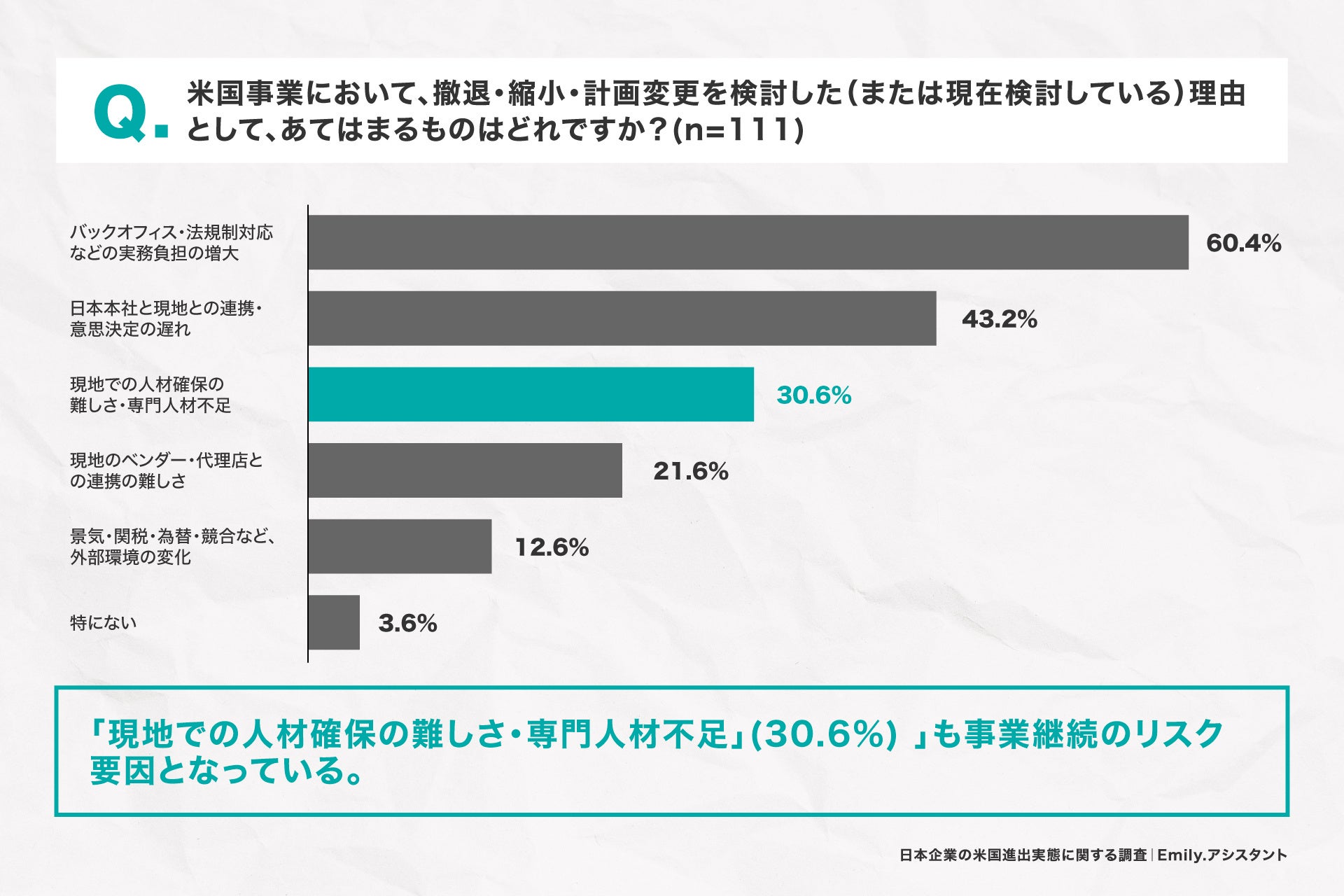 「米国事業からの撤退や縮小、計画変更を検討した(または検討している)理由を教えてください。(複数回答)」と質問したところ、「バックオフィス・法規制対応などの実務負担の増大」(60.4%)、「日本本社と現地との連携・意思決定の遅れ」(43.2%)に次いで、「現地での人材確保の難しさ・専門人材不足」が30.6%で3位となりました。