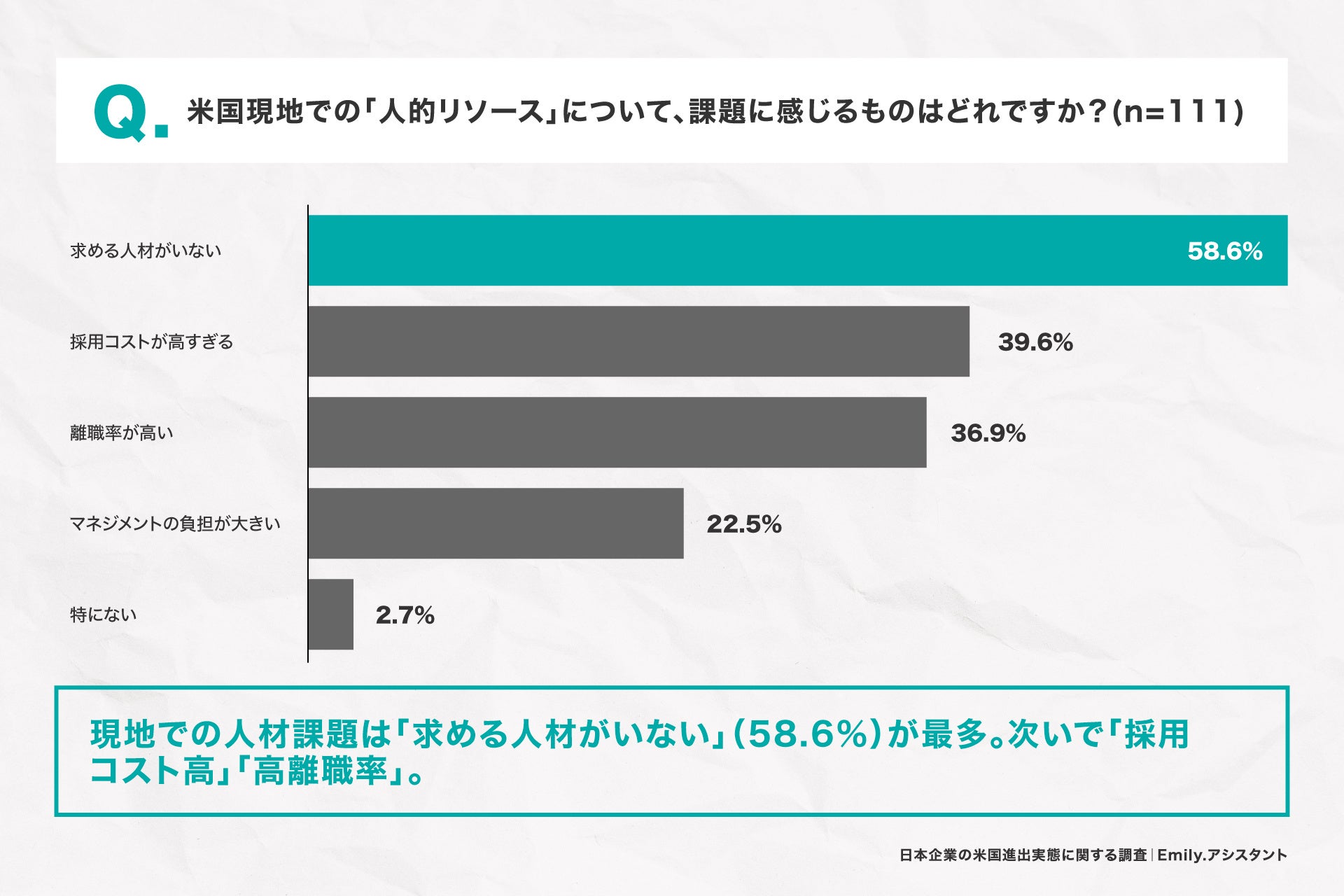 「米国現地での人的リソースに関する課題を教えてください。(複数回答)」と質問したところ、「求める人材がいない」が58.6%で最も多い結果となりました。